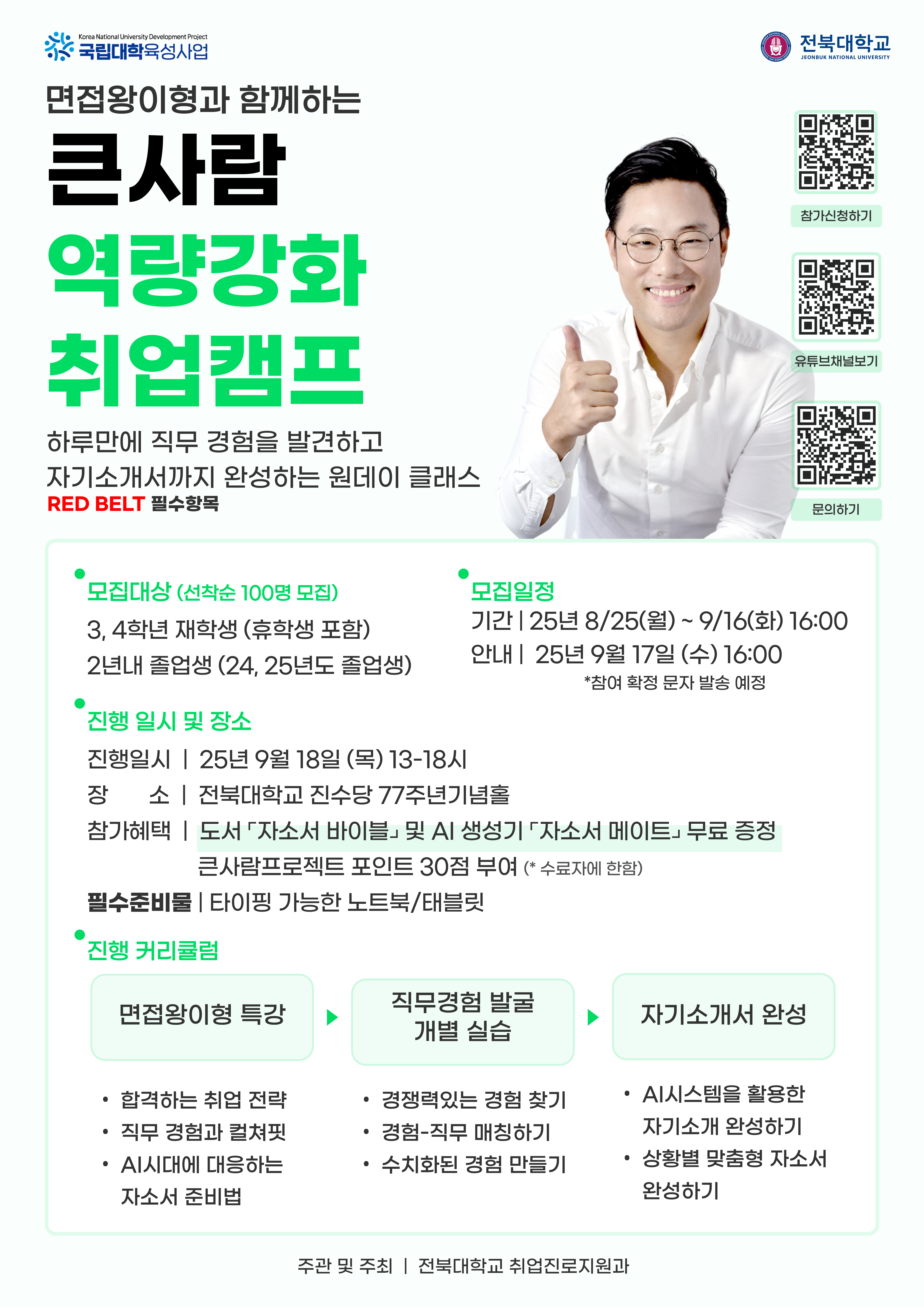 * 신청방법: 취업진로지원과 홈페이지>프로그램>프로그램 참가신청 ※ 포스터 내 QR 신청이 아닌, 반드시 취업진로지원과 홈페이지에서 신청 바람