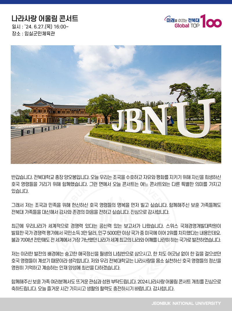 반갑습니다. 전북대학교 총장 양오봉입니다. 오늘 우리는 조국을 수호하고 자유와 평화를 지키기 위해 자신을 희생하신 호국 영령들을 기리기 위해 함께했습니다. 그런 면에서 오늘 콘서트는 여느 콘서트와는 다른 특별한 의미를 가지고 있습니다. 그래서 저는 조국과 민족을 위해 헌신하신 호국 영령들의 명복을 먼저 빌고 싶습니다. 함께해주신 보훈 가족들께도 전북대 가족들을 대신해서 감사와 존경의 마음을 전하고 싶습니다. 진심으로 감사합니다. 최근에 우리나라가 세계적으로 경쟁력 있다는 공신력 있는 보고서가 나왔습니다. 스위스 국제경영개발대학원이 발표한 국가 경쟁력 평가에서 국민소득 3만 달러, 인구 5000만 이상 국가 중 미국에 이어 2위를 차지했다는 내용인데요. 불과 70여년 전만해도 전 세계에서 가장 가난했던 나라가 세계 최고의 나라와 어깨를 나란히 하는 국가로 발전하였습니다. 저는 이러한 발전의 배경에는 숭고한 애국정신을 필생의 나침반으로 삼으시고, 한 치도 어긋남 없이 한 길을 걸으셨던 호국 영령들이 계셨기 때문이라 생각합니다. 저와 우리 전북대학교는 나라사랑을 몸소 실천하신 호국 영령들의 정신을 영원히 기억하고 계승하는 인재 양성에 최선을 다하겠습니다. 함께해주신 보훈 가족 여러분께서도 뜨거운 관심과 성원 부탁드립니다. 2024 나라사랑 어울림 콘서트 개최를 진심으로 축하드립니다. 오늘 즐거운 시간 가지시고 생활의 활력도 충전하시기 바랍니다. 감사합니다.