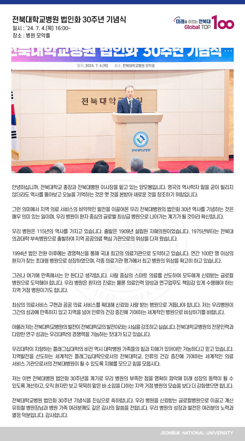 전북대학교병원 법인화 30주년 기념식을 진심으로 축하합니다. 우리 병원을 신뢰받는 글로컬병원으로 이끌고 계신 유희철 병원장님과 병원 가족 여러분께도 깊은 감사의 말씀을 전합니다. 우리 병원의 성장과 발전은 여러분의 노력과 열정 덕분입니다. 감사합니다.