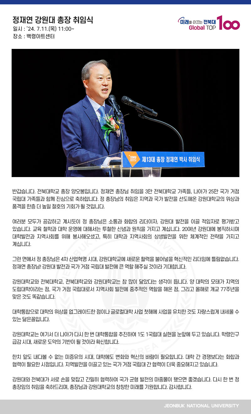 반갑습니다. 전북대학교 총장 양오봉입니다. 정재연 총장님 취임을 3만 전북대학교 가족들, 나아가 25만 국가 거점 국립대 가족들과 함께 진심으로 축하합니다. 정 총장님의 취임은 지역과 국가 발전을 선도해온 강원대학교의 위상과 품격을 한층 더 높일 절호의 기회가 될 것입니다.