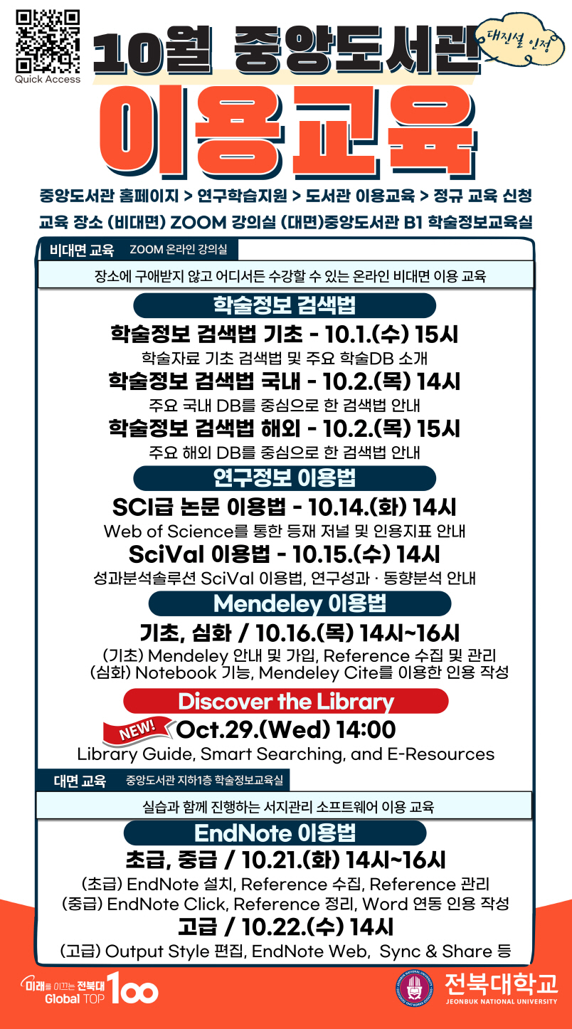 4. 교육문의: 중앙도서관 학술연구지원팀(270 4408, lib4407@jbnu.ac.kr)