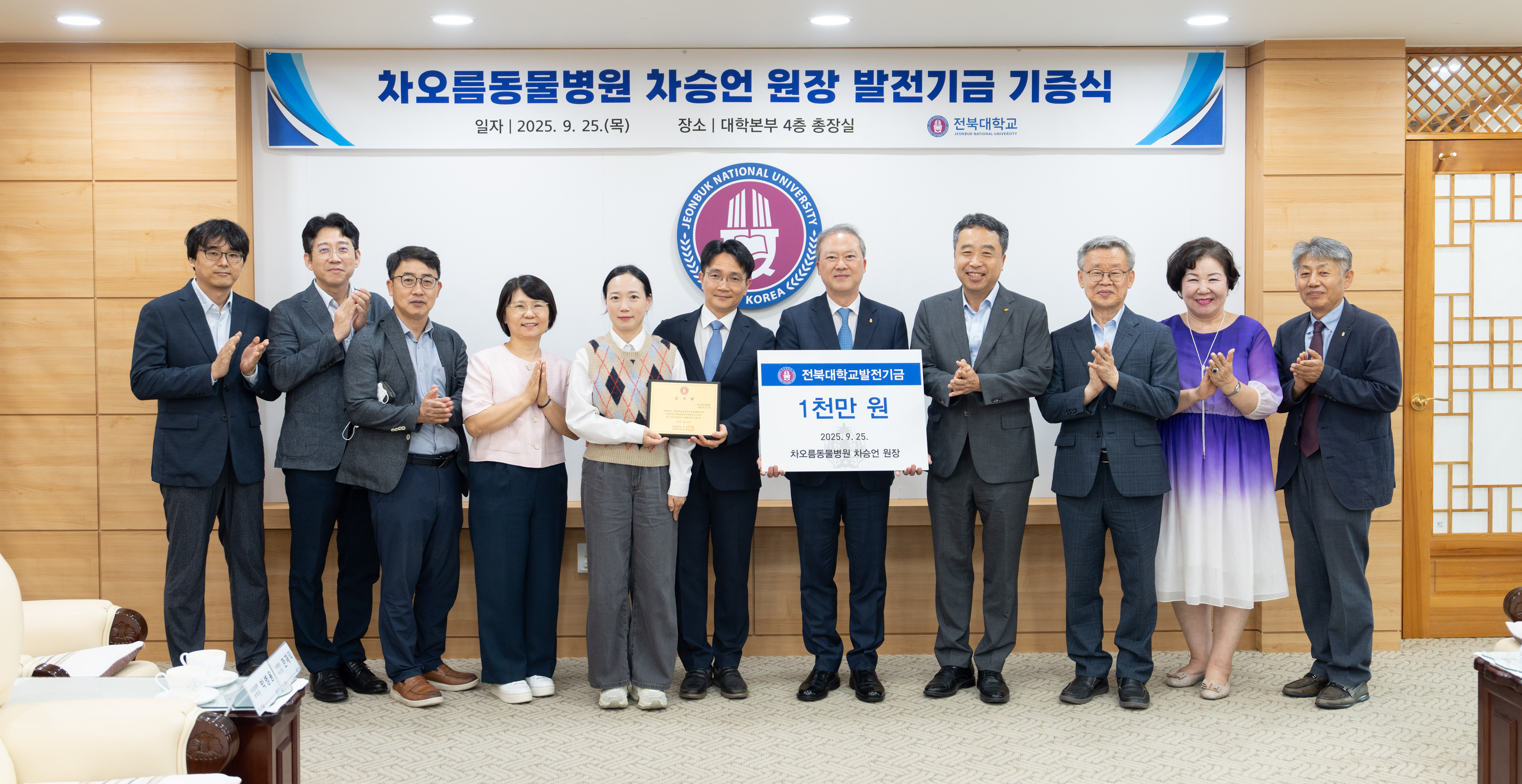 전북대는 이날 대학본부 총장실에서 양오봉 총장과 주요 보직자, 차승언 원장이 참석한 가운데 기증식을 열고 감사패를 전달했다.