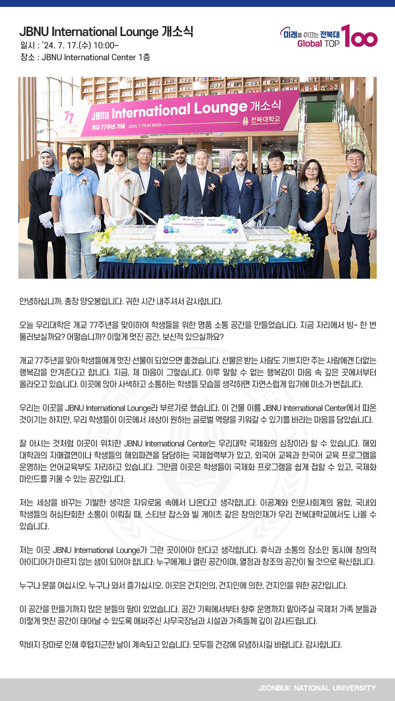 안녕하십니까. 총장 양오봉입니다. 귀한 시간 내주셔서 감사합니다. 오늘 우리대학은 개교 77주년을 맞이하여 학생들을 위한 명품 소통 공간을 만들었습니다. 지금 자리에서 빙~ 한 번 둘러보실까요? 어떻습니까? 이렇게 멋진 공간, 보신적 있으실까요? 개교 77주년을 맞아 학생들에게 멋진 선물이 되었으면 좋겠습니다. 선물은 받는 사람도 기쁘지만 주는 사람에겐 더없는 행복감을 안겨준다고 합니다. 지금, 제 마음이 그렇습니다. 이루 말할 수 없는 행복감이 마음 속 깊은 곳에서부터 올라오고 있습니다. 이곳에 앉아 사색하고 소통하는 학생들 모습을 생각하면 자연스럽게 입가에 미소가 번집니다. 우리는 이곳을 JBNU International Lounge라 부르기로 했습니다. 이 건물 이름 JBNU International Center에서 따온 것이기는 하지만, 우리 학생들이 이곳에서 세상이 원하는 글로벌 역량을 키워갈 수 있기를 바라는 마음을 담았습니다. 잘 아시는 것처럼 이곳이 위치한 JBNU International Center는 우리대학 국제화의 심장이라 할 수 있습니다. 해외 대학과의 자매결연이나 학생들의 해외파견을 담당하는 국제협력부가 있고, 외국어 교육과 한국어 교육 프로그램을 운영하는 언어교육부도 자리하고 있습니다. 그만큼 이곳은 학생들이 국제화 프로그램을 쉽게 접할 수 있고, 국제화 마인드를 키울 수 있는 공간입니다. 저는 세상을 바꾸는 기발한 생각은 자유로움 속에서 나온다고 생각합니다. 이공계와 인문사회계의 융합, 국내외 학생들의 허심탄회한 소통이 이뤄질 때, 스티브 잡스와 빌 게이츠 같은 창의인재가 우리 전북대학교에서도 나올 수 있습니다. 저는 이곳 JBNU International Lounge가 그런 곳이어야 한다고 생각합니다. 휴식과 소통의 장소인 동시에 창의적 아이디어가 마르지 않는 샘이 되어야 합니다. 누구에게나 열린 공간이며, 열정과 창조의 공간이 될 것으로 확신합니다. 누구나 문을 여십시오. 누구나 와서 즐기십시오. 이곳은 건지인의, 건지인에 의한, 건지인을 위한 공간입니다. 이 공간을 만들기까지 많은 분들의 땀이 있었습니다. 공간 기획에서부터 향후 운영까지 맡아주실 국제처 가족 분들과 이렇게 멋진 공간이 태어날 수 있도록 애써주신 사무국장님과 시설과 가족들께 깊이 감사드립니다. 막바지 장마로 인해 후텁지근한 날이 계속되고 있습니다. 모두들 건강에 유념하시길 바랍니다. 감사합니다.