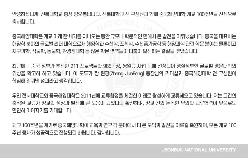 안녕하십니까. 전북대학교 총장 양오봉입니다. 전북대학교 전 구성원과 함께 중국해양대학 개교 100주년을 진심으로 축하합니다. 중국해양대학은 개교 이래 한 세기를 지나오는 동안 규모나 학문적인 면에서 큰 발전을 이뤄냈습니다. 중국을 대표하는 해양학 분야의 글로벌 리더 대학으로서 해양학과 수산학, 포획학, 수산품가공학 등 해양과학 관련 학문 분야는 물론이고 지구과학, 식물학, 동물학, 환경생태학 등 많은 학문 영역들이 더불어 발전하는 결실을 맺었습니다. 최근에는 중국 정부가 추진한 211 프로젝트와 985공정, 쌍일류 사업 등에 선정되어 명실상부한 글로벌 명문대학의 위상을 확고히 하고 있습니다. 이 모두가 짱 쥔펑(Zhang JunFeng) 총장님의 리더십과 중국해양대학 전 구성원이 합심해 일궈낸 성과라고 생각합니다. 우리 전북대학교와 중국해양대학은 2011년에 교류협정을 체결한 이래로 왕성하게 교류해오고 있습니다. 저는 그간의 축적된 교류가 양교의 성장과 발전에 큰 도움이 되었다고 확신하며, 양교 간의 돈독한 우의와 교류협력이 앞으로도 면면히 이어지기를 기대합니다. 개교 100주년을 계기로 중국해양대학이 교육과 연구 각 분야에서 더 큰 도약과 발전을 이루길 축원하며, 모든 개교 100주년 행사가 성공적으로 진행되길 바랍니다. 감사합니다.