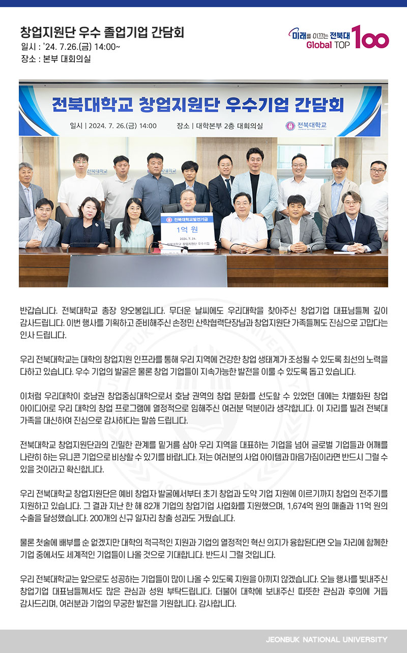 반갑습니다. 전북대학교 총장 양오봉입니다. 무더운 날씨에도 우리대학을 찾아주신 창업기업 대표님들께 깊이 감사드립니다. 이번 행사를 기획하고 준비해주신 손정민 산학협력단장님과 창업지원단 가족들께도 진심으로 고맙다는 인사 드립니다. 우리 전북대학교는 대학의 창업지원 인프라를 통해 우리 지역에 건강한 창업 생태계가 조성될 수 있도록 최선의 노력을 다하고 있습니다. 우수 기업의 발굴은 물론 창업 기업들이 지속가능한 발전을 이룰 수 있도록 돕고 있습니다. 이처럼 우리대학이 호남권 창업중심대학으로서 호남 권역의 창업 문화를 선도할 수 있었던 데에는 차별화된 창업 아이디어로 우리 대학의 창업 프로그램에 열정적으로 임해주신 여러분 덕분이라 생각합니다. 이 자리를 빌려 전북대 가족을 대신하여 진심으로 감사하다는 말씀 드립니다. 전북대학교 창업지원단과의 긴밀한 관계를 밑거름 삼아 우리 지역을 대표하는 기업을 넘어 글로벌 기업들과 어깨를 나란히 하는 유니콘 기업으로 비상할 수 있기를 바랍니다. 저는 여러분의 사업 아이템과 마음가짐이라면 반드시 그럴 수 있을 것이라고 확신합니다. 우리 전북대학교 창업지원단은 예비 창업자 발굴에서부터 초기 창업과 도약 기업 지원에 이르기까지 창업의 전주기를 지원하고 있습니다. 그 결과 지난 한 해 82개 기업의 창업기업 사업화를 지원했으며, 1,674억 원의 매출과 11억 원의 수출을 달성했습니다. 200개의 신규 일자리 창출 성과도 거뒀습니다. 물론 첫술에 배부를 순 없겠지만 대학의 적극적인 지원과 기업의 열정적인 혁신 의지가 융합된다면 오늘 자리에 함께한 기업 중에서도 세계적인 기업들이 나올 것으로 기대합니다. 반드시 그럴 것입니다. 우리 전북대학교는 앞으로도 성공하는 기업들이 많이 나올 수 있도록 지원을 아끼지 않겠습니다. 오늘 행사를 빛내주신 창업기업 대표님들께서도 많은 관심과 성원 부탁드립니다. 더불어 대학에 보내주신 따뜻한 관심과 후의에 거듭 감사드리며, 여러분과 기업의 무궁한 발전을 기원합니다. 감사합니다.