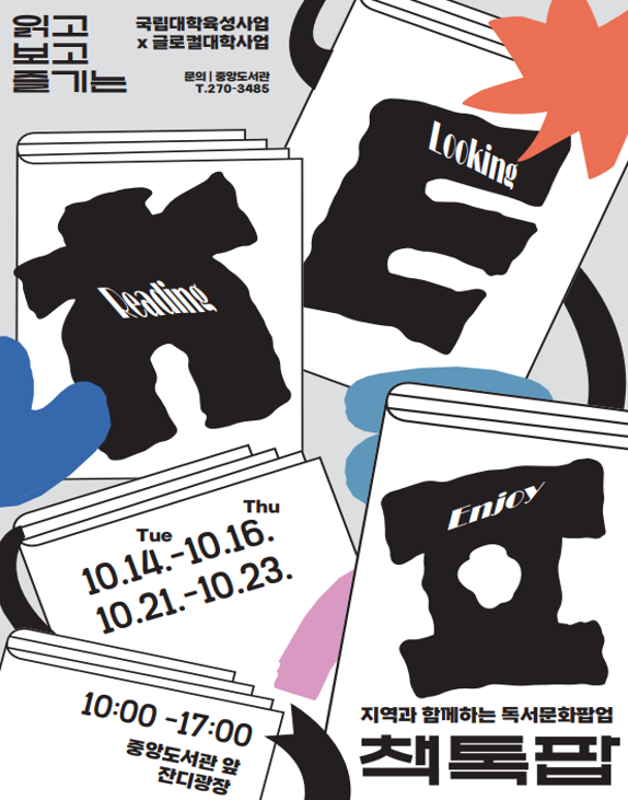 전북대는 국립대학육성사업과 글로컬대학사업의 일환으로 오는 10월 14일부터 23일까지 중앙도서관 앞 잔디광장에서 ‘책‧톡‧팝 : 읽고, 보고, 즐기는 독서 문화 팝업’을 개최한다고 13일 밝혔다.