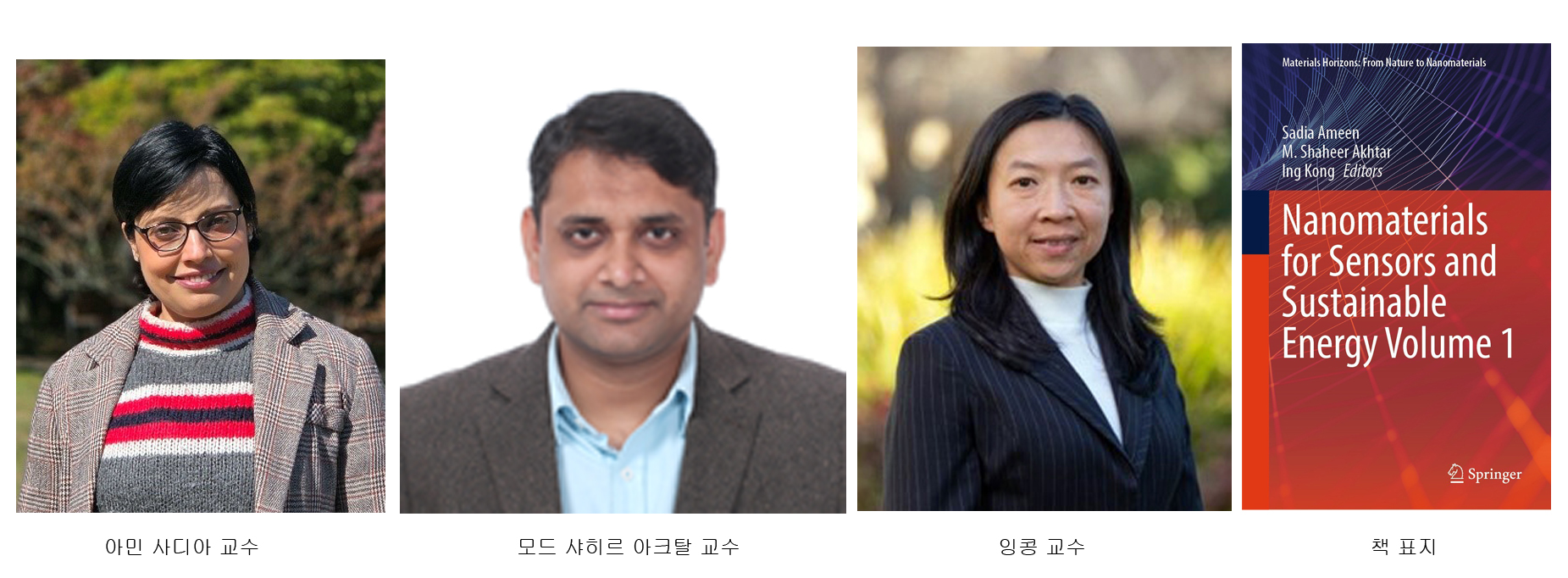 전북대학교 바이오융합과학과 사디아 아민(Sadia Ameen) 교수와 통합에너지-AI 대학원 모하마드 샤히르 아크탈(Mohammad Shaheer Akhtar) 교수가 호주 라트로브 대학교(La Trobe University)의 잉 콩(Ing Kong) 교수와 함께 첨단 나노소재 연구의 최신 성과를 담은 전문 학술서 『센서 및 지속가능 에너지를 위한 나노소재(Nanomaterials for Sensors and Sustainable Energy)』(전 2권)를 세계적 학술출판사 스프링어 네이처(Springer Nature) 를 통해 출간했다.