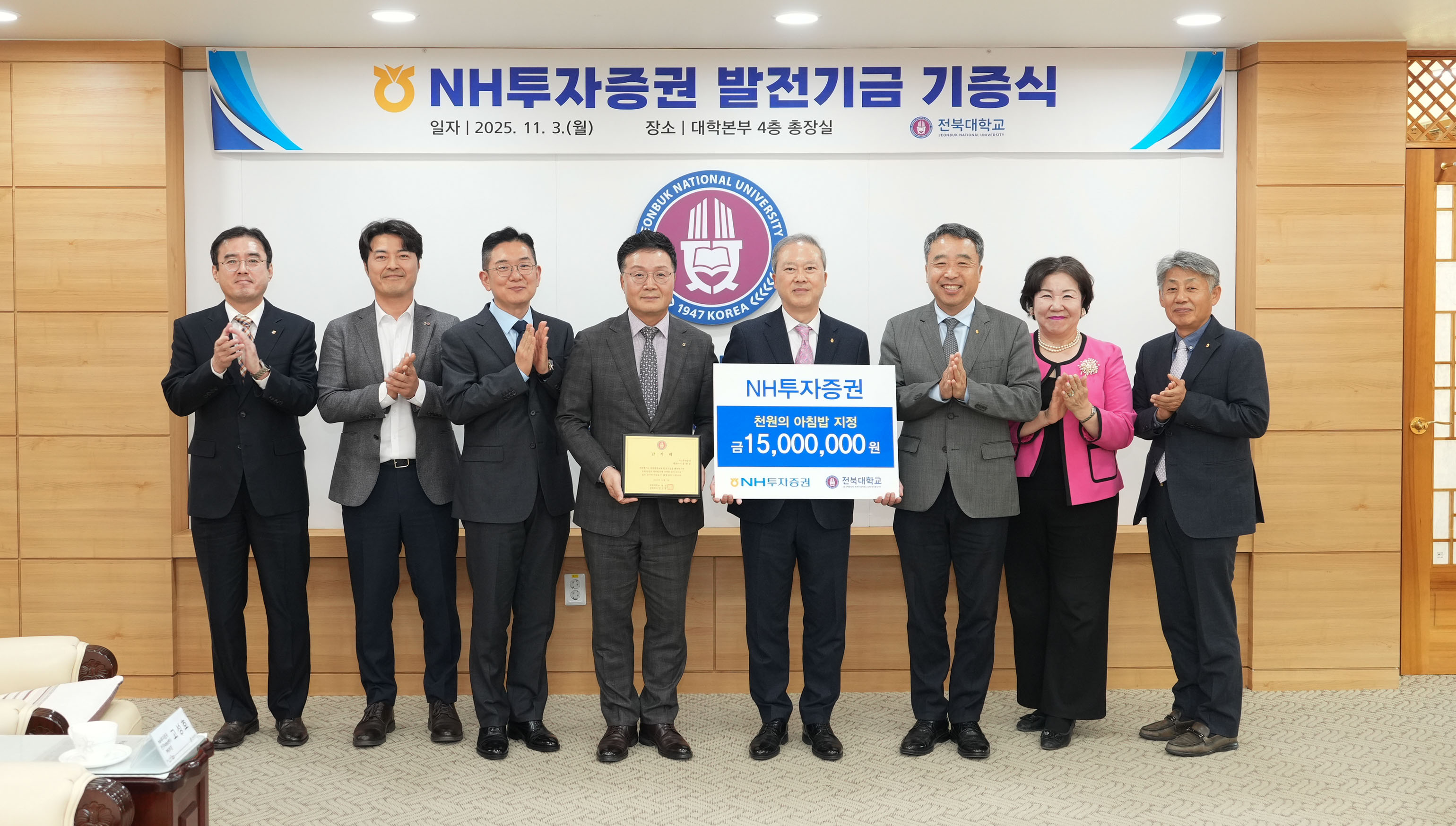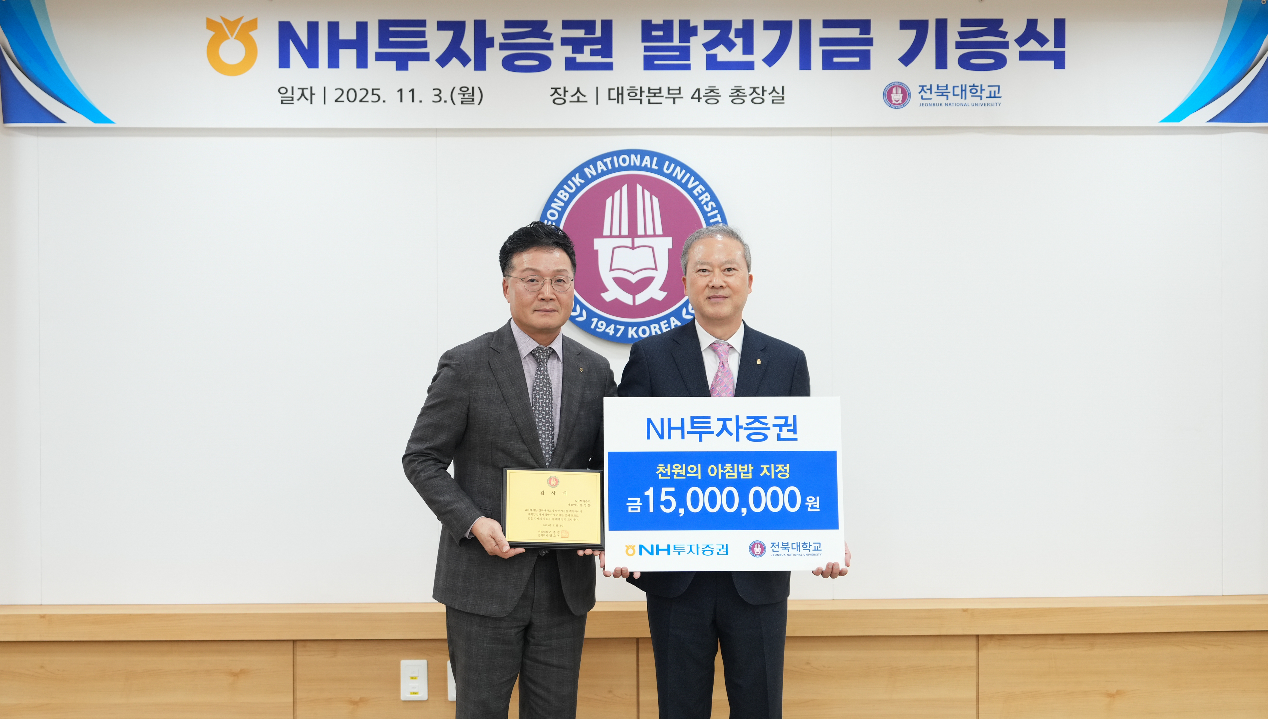 재학생의 건강한 아침 식습관 형성과 지역 쌀 소비 증진을 위한 전북대학교의 ‘천원의 아침밥’ 사업에 따뜻한 기부가 잇따르고 있다. 최근 많은 동문들의 참여에 이어 대한민국 대표 종합금융투자 기업인 NH투자증권이 1,500만 원의 발전기금을 기부하며 대학의 뜻깊은 사업에 동참했다.