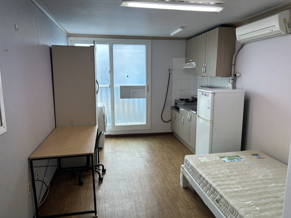 책상, 옷장, 냉장고, 가스레인지, 싱크대, 세탁기, 에어컨, 침대 있습니다!