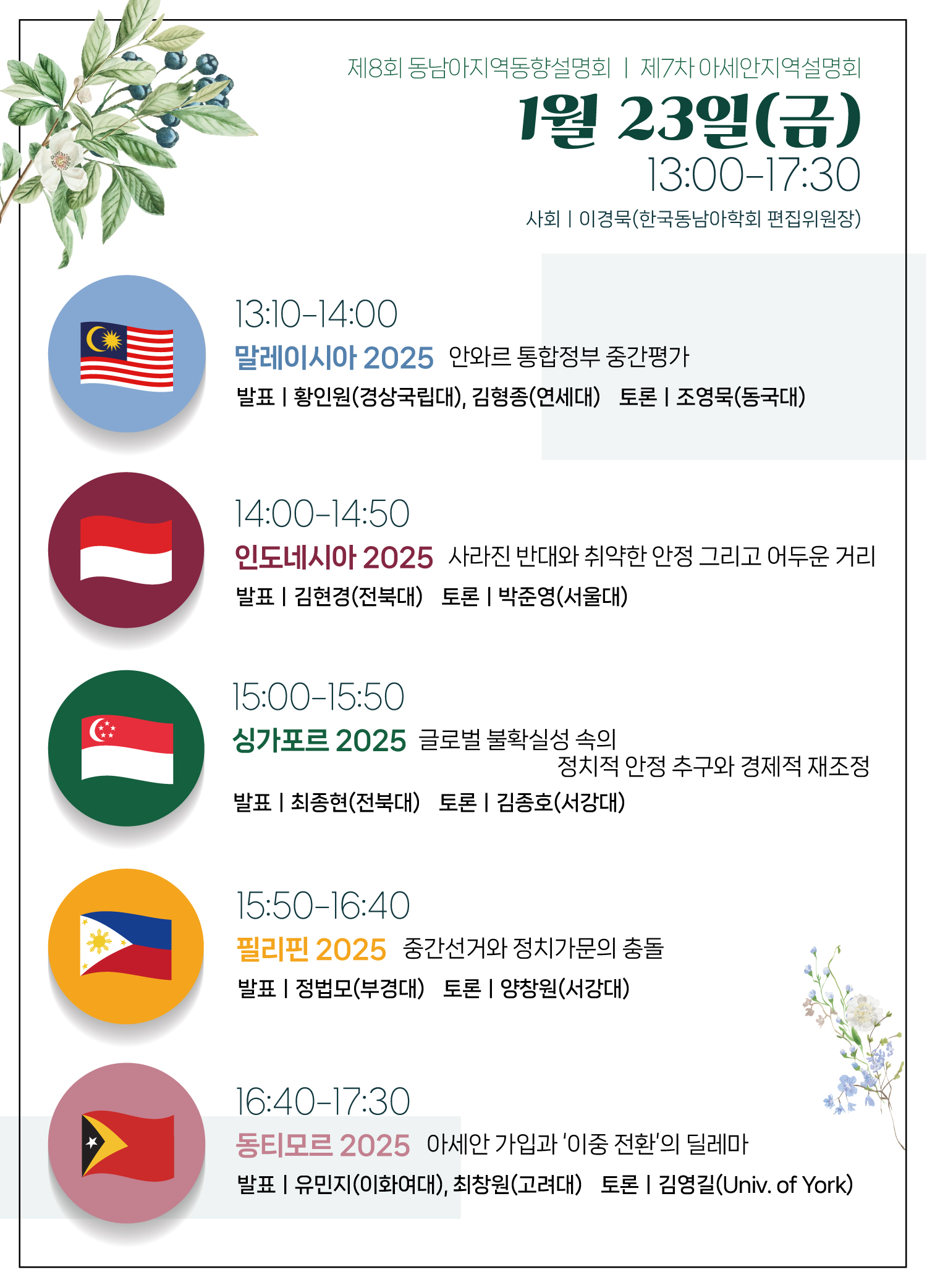 이튿날에는 말레이시아 안와르 통합정부 평가, 인도네시아 정치 및 사회 안정성, 싱가포르의 정치·경제 전략, 필리핀 중간선거, 동티모르의 아세안 가입 문제를 중심으로 논의가 이어질 예정이다.