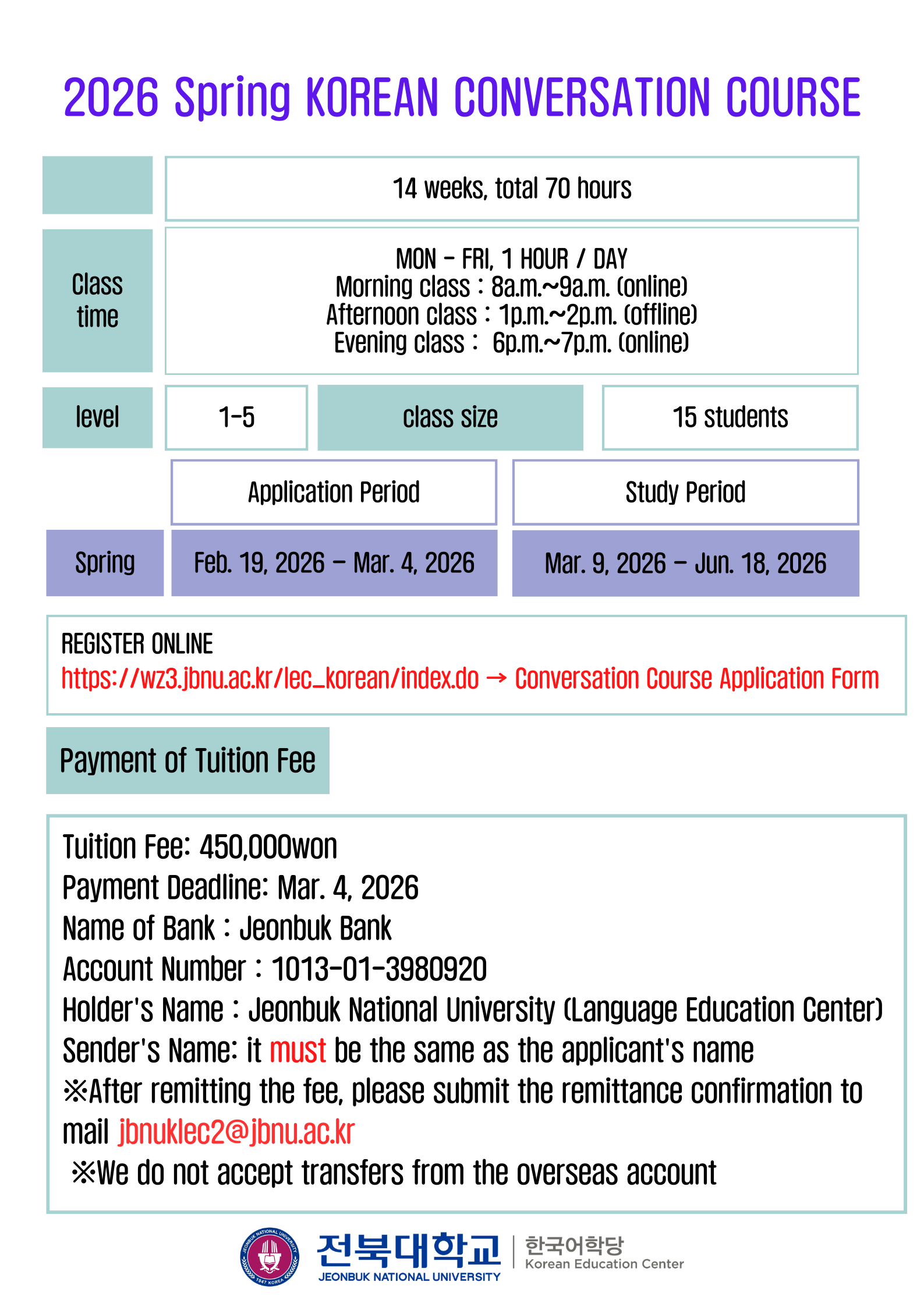 ※ After completing the payment, please send the receipt to our email: jbnuklec2@jbnu.ac.kr