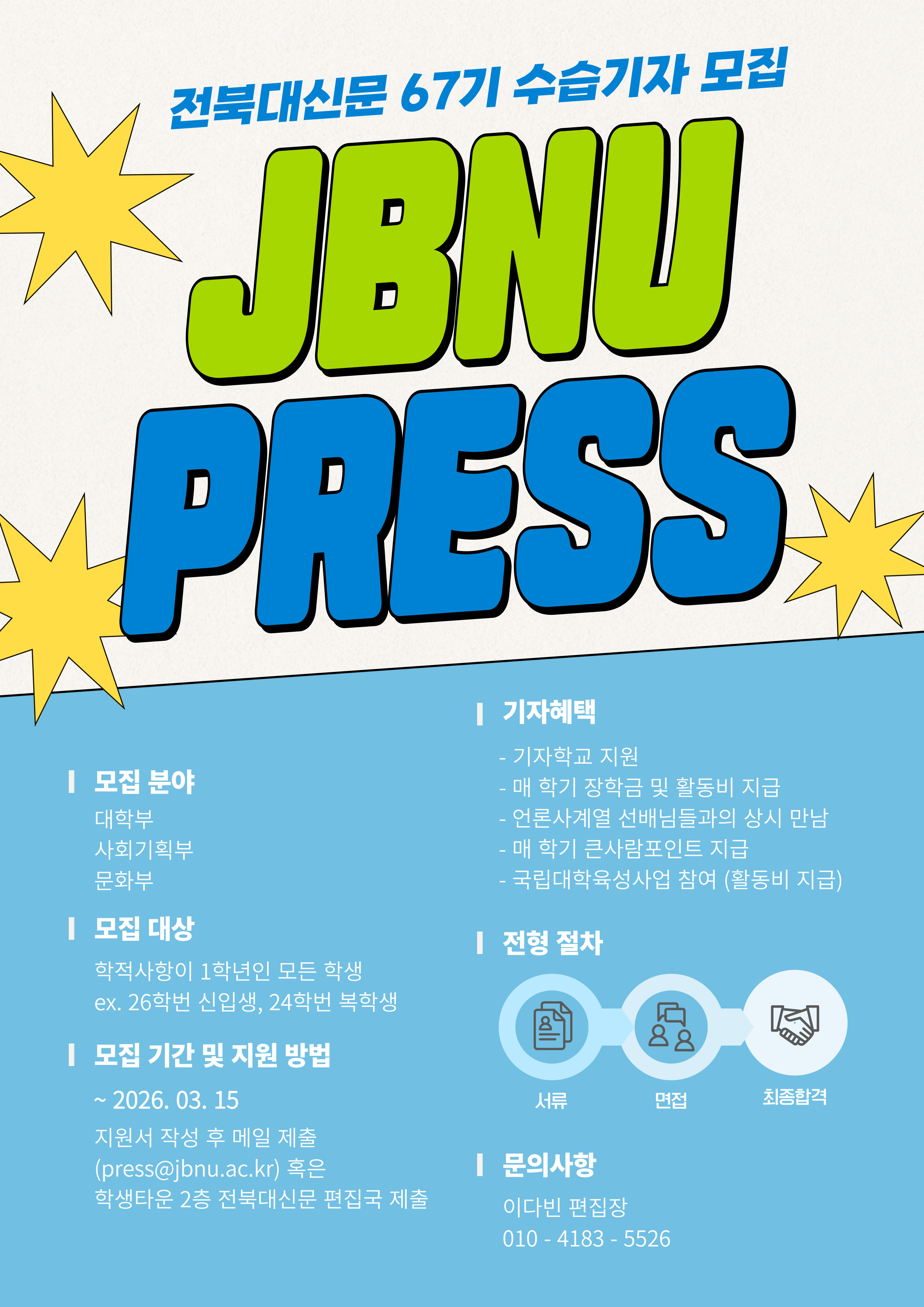 - 접수 방법: 지원서 작성 후 이메일(press@jbnu.ac.kr)로 발송 혹은 학생타운 2층 전북대신문 편집국 방문 제출