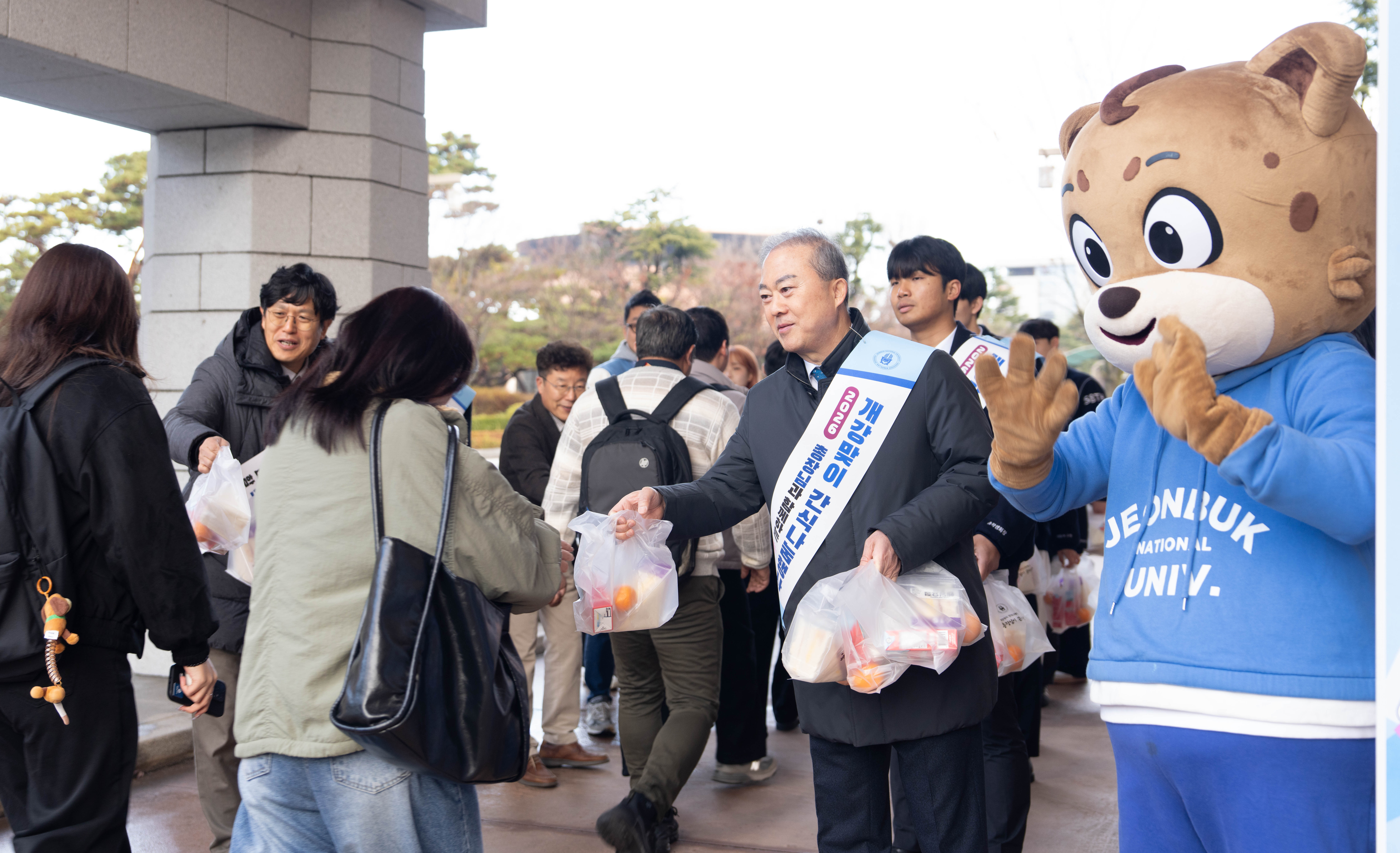 전북대학교가 새 학기를 맞아 3월 3일 등교하는 학생들에게 개강맞이 간식나눔 행사를 열었다. 이날 행사에서는 양오봉 총장을 비롯한 대학 본부 보직자들과 학생자치회 임원들이 직접 등교하는 학생들에게 간식을 나눠주며 훈훈한 인사를 건넸다.