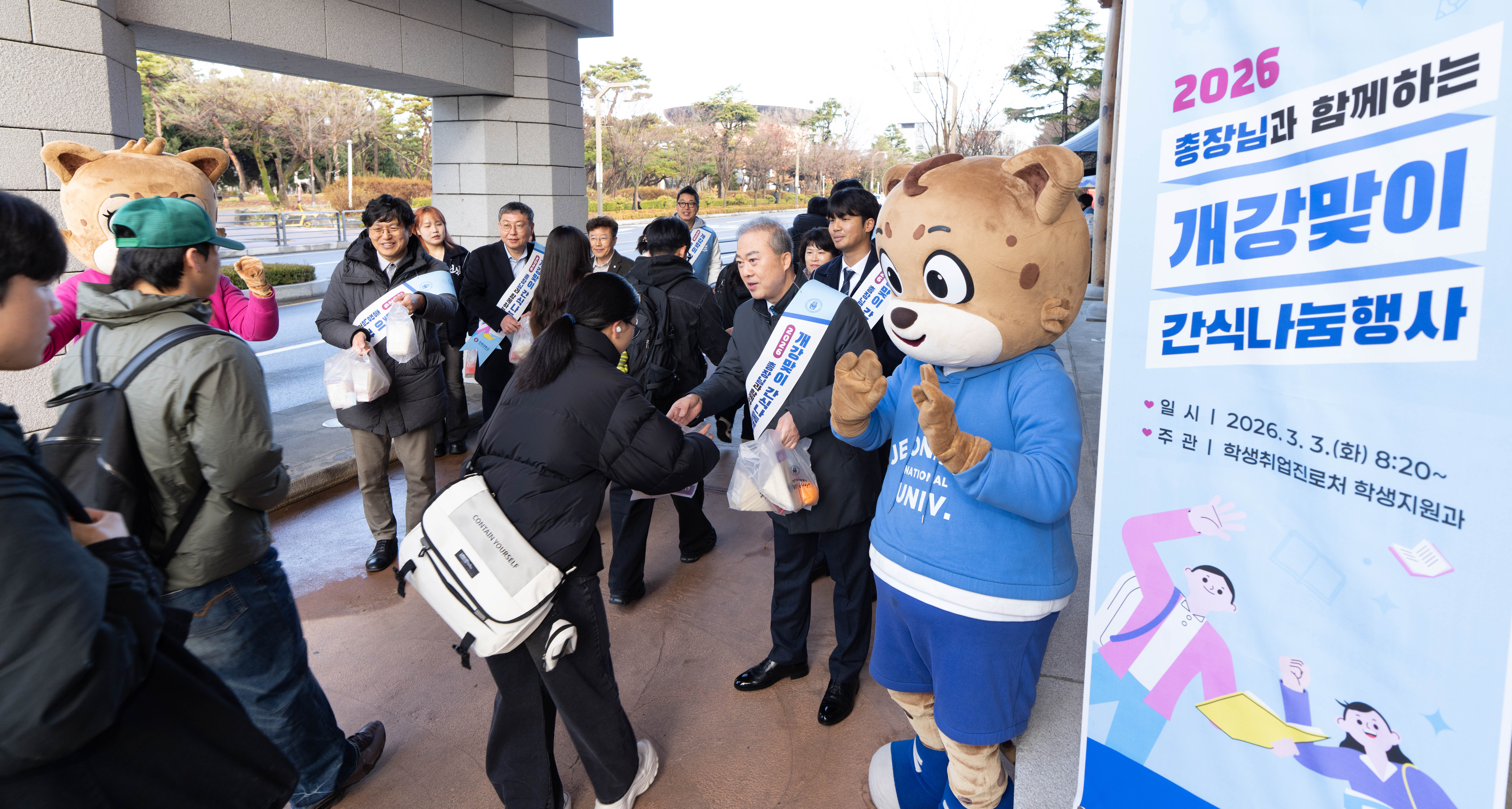 간식을 건네받은 한 신입생은 “개강 첫날부터 총장님의 응원을 받으며 등교하니 대학생활이 기대된다”며 “총장님의 따뜻한 격려에 힘입어 더욱 열정적인 대학생활을 해나가겠다”고 밝혔다.