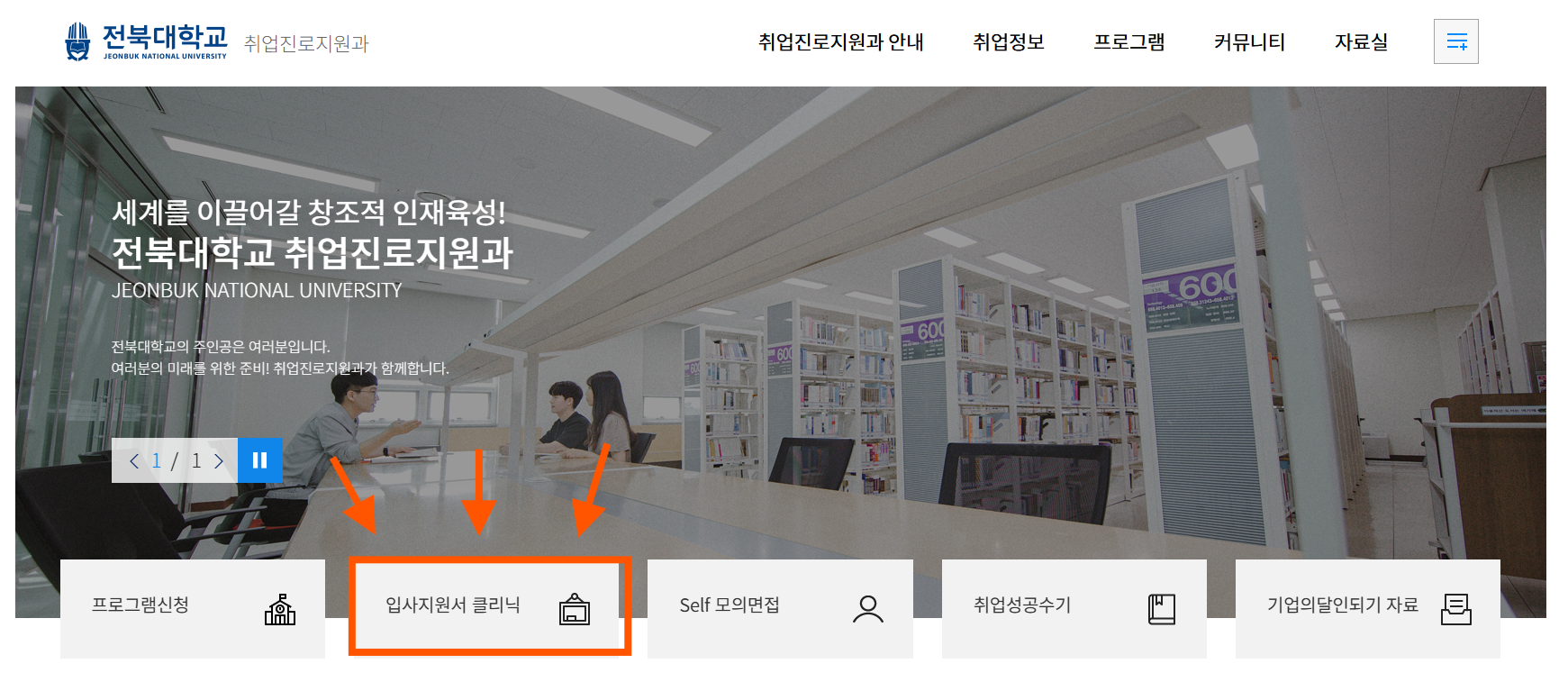 ○ 이용방법: 취업진로지원과 홈페이지( https://career.jbnu.ac.kr/career/index.do) [입사지원서 클리닉] 접속 ※ 하단 이미지 참고