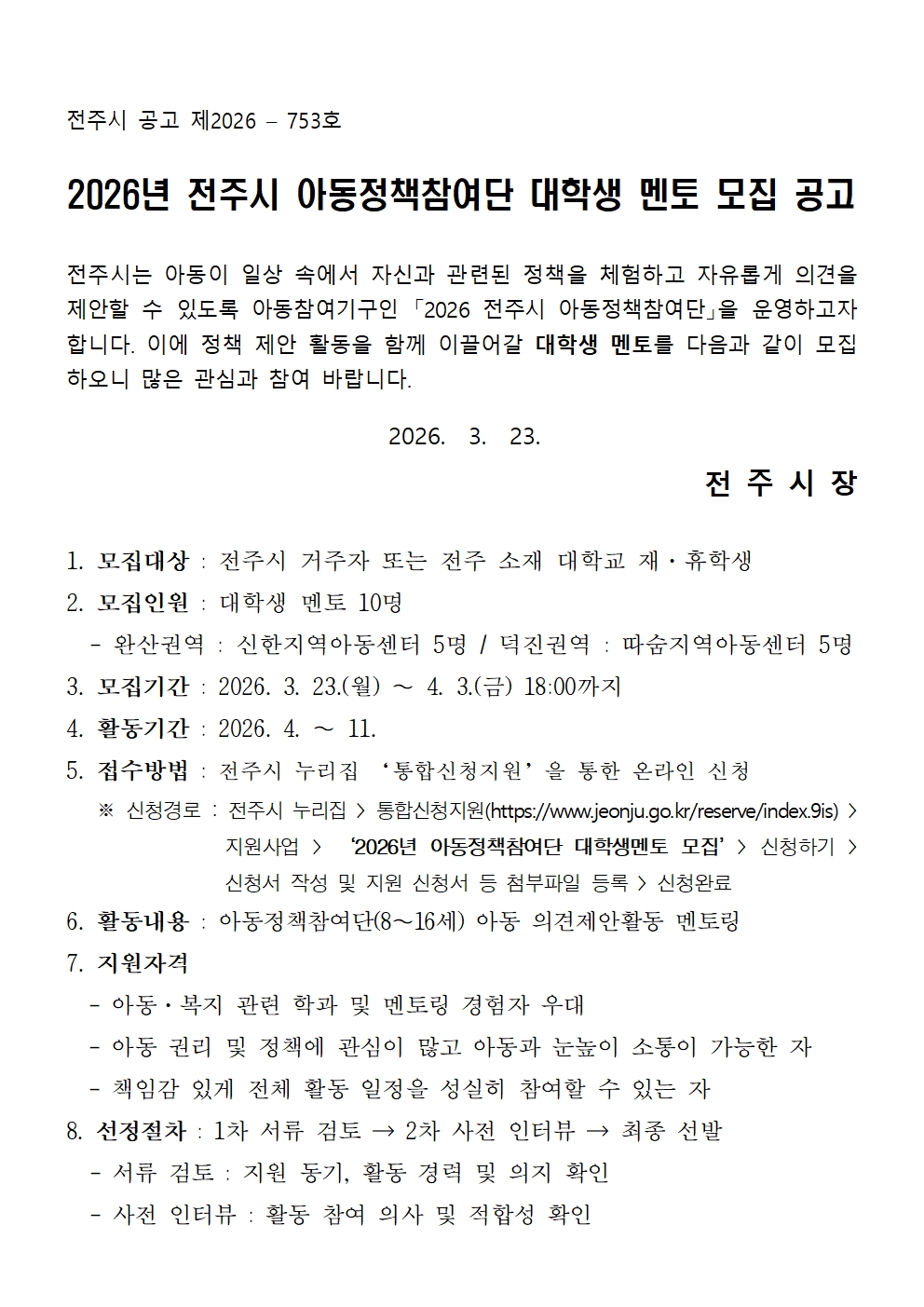 전주시에서 2026년 아동정책참여단 대학생멘토를 모집합니다. 관심있는 학생들의 참여 바랍니다.