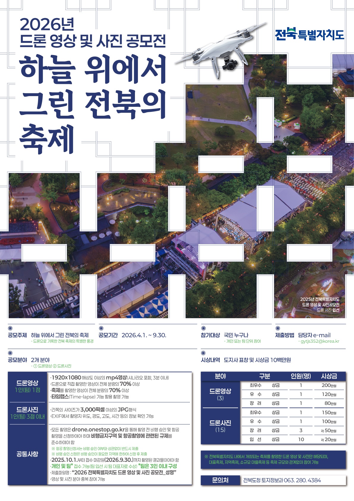 ? 접수기간 : 2026. 4. 1. ~ 9. 30. 18:00까지 ? 공모자격 : 국민 누구나(개인 또는 팀 단위 참여 가능) ? 공모분야 : 2개 분야(드론 영상, 드론 사진) ? 접수방법 : 담당자 이메일(gytjs352@korea.kr)로 접수 ? 시상내역 : 우수작 18점, 총 상금 1,000만원 ※ 접수서식 등 세부사항은 전북 소통대로(https://policy.jb.go.kr) - 공모제안에서 확인 |
