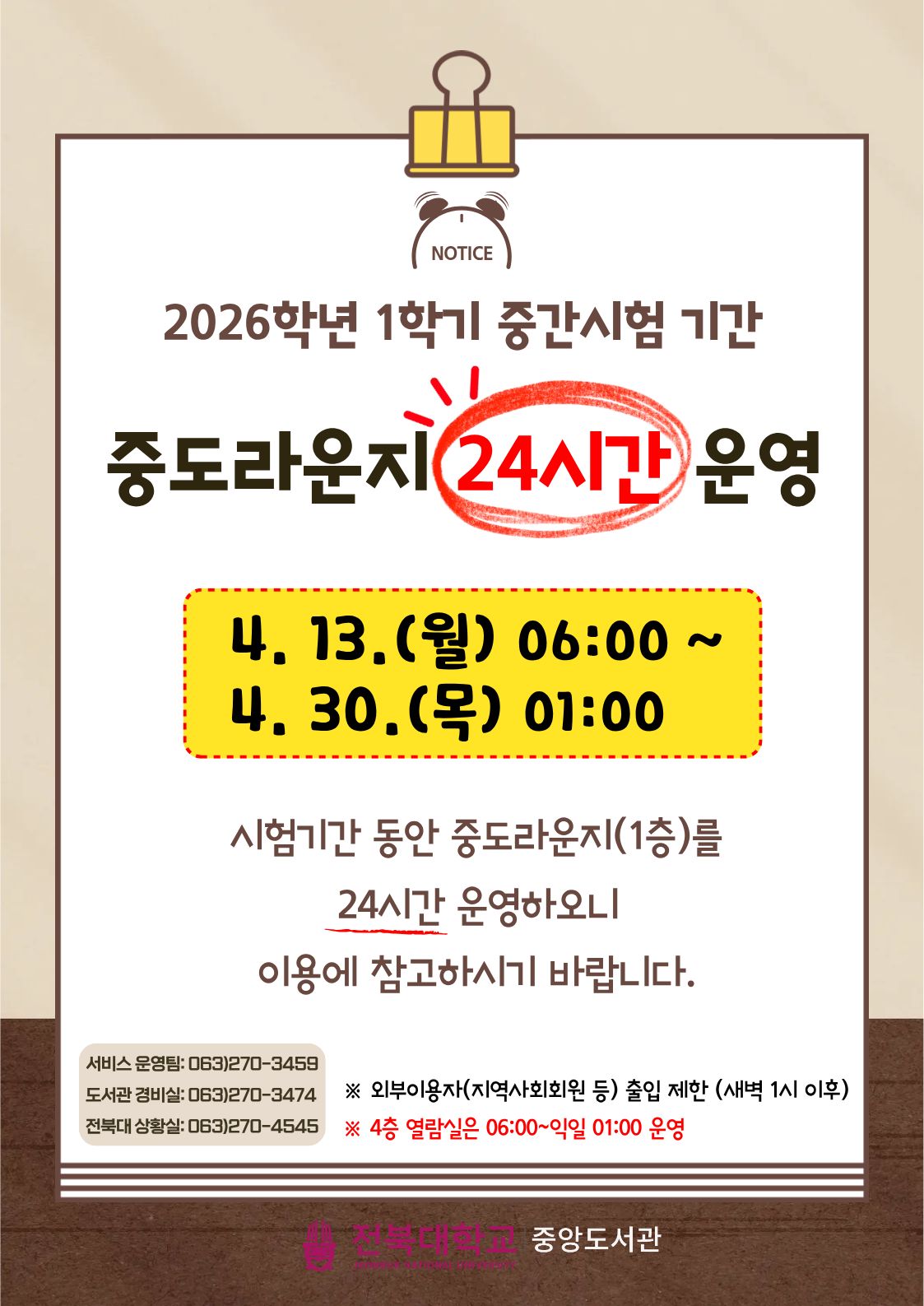 2026학년도 1학기 중간시험 기간 중도라운지 24시간 운영 안내