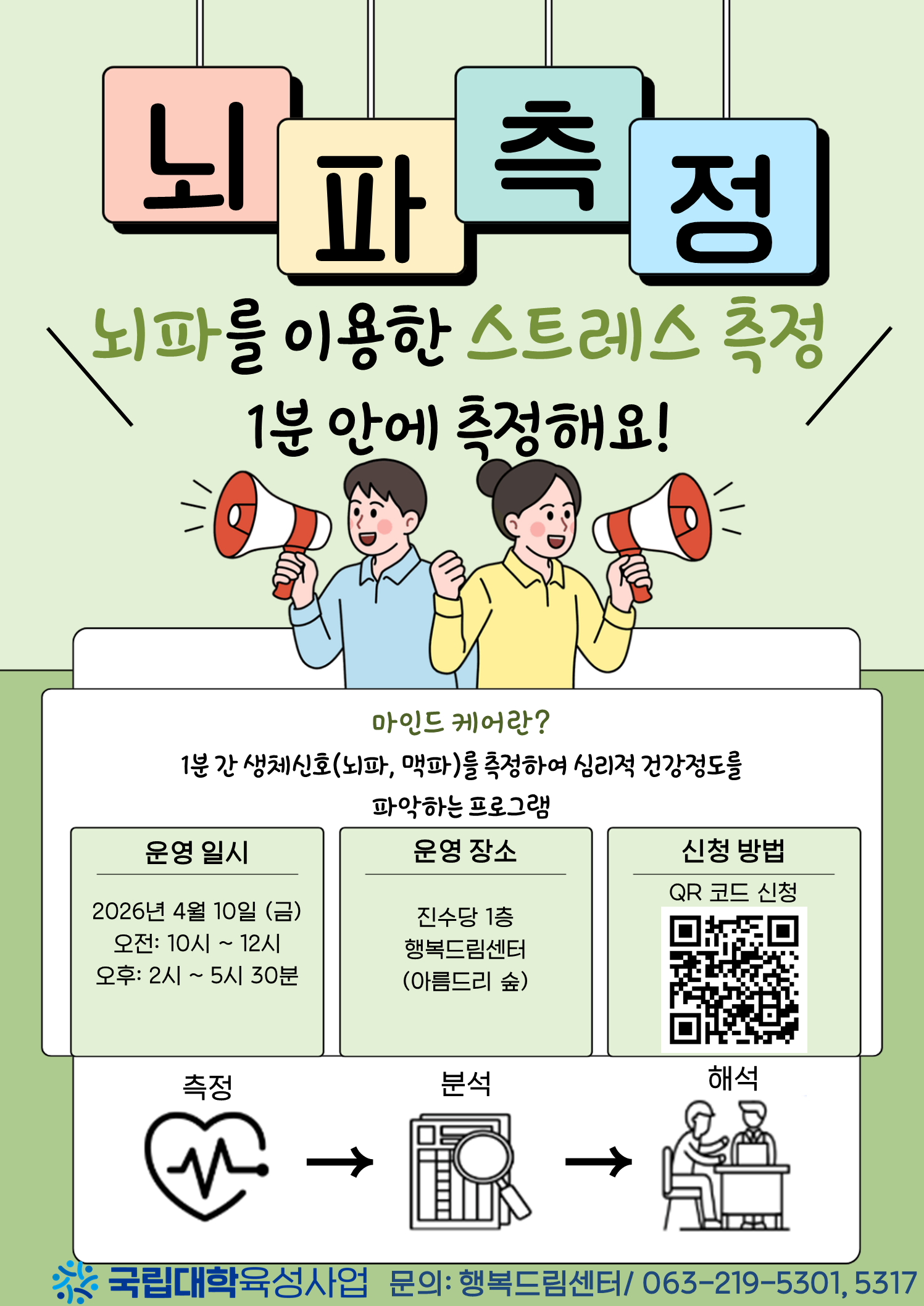 뇌파측정기계를 통해 1분동안 생체 신호(맥박, 뇌파)를 측정하여 스트레스 지수, 두뇌 컨디션 등 심리적 건강정도를 파악하는 프로그램입니다