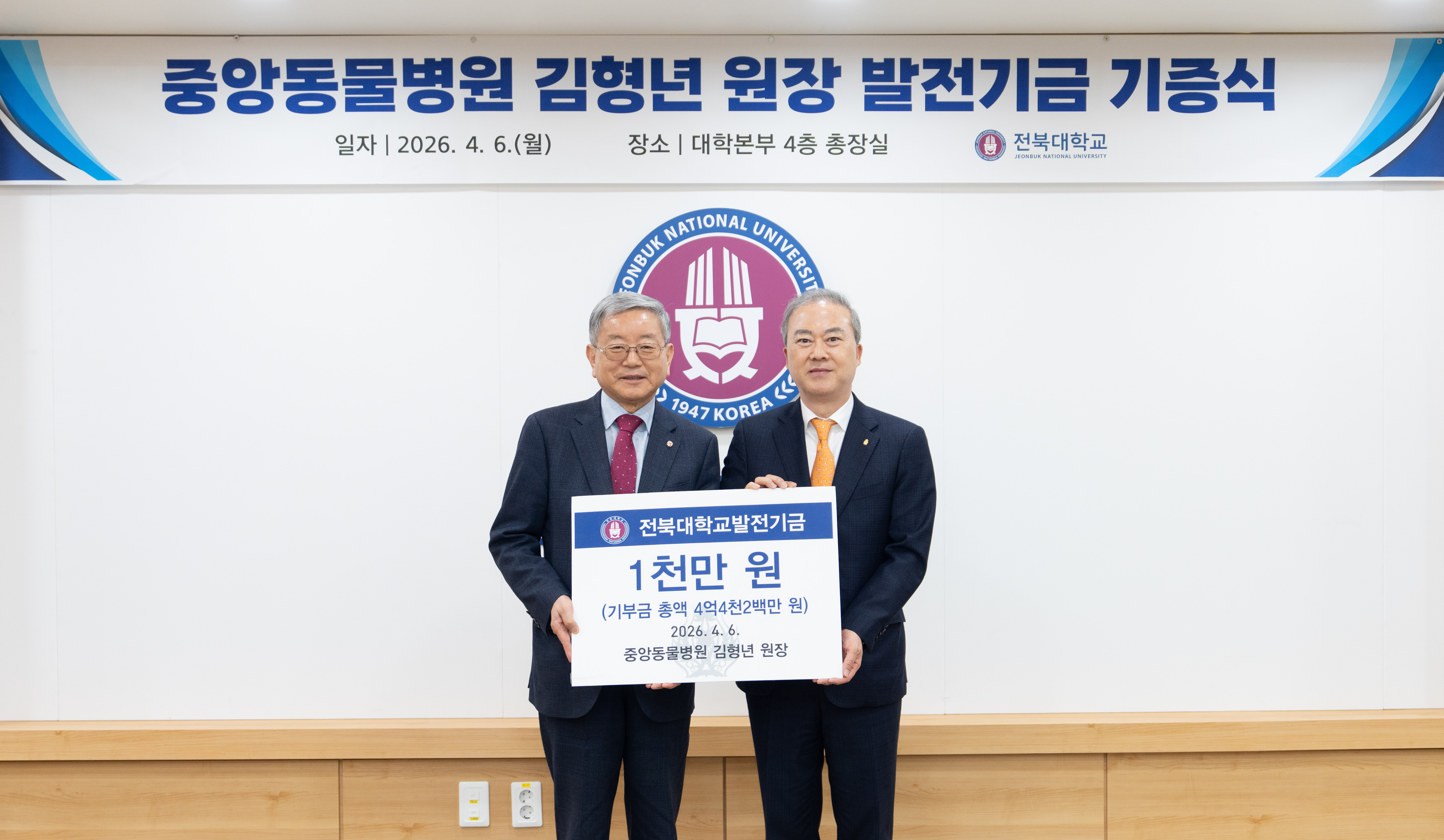 양오봉 총장은 감사패를 전달하며 “24년이라는 긴 시간 동안 한결같은 마음으로 모교와 동행해주신 김형년 원장님의 헌신에 깊은 존경과 감사를 드린다”며 “기탁해주신 소중한 기금은 그 뜻을 받들어 세계적 수준의 수의학 인재를 양성하고 교육 환경을 혁신하는 데 의미 있게 활용하겠다”고 말했다.