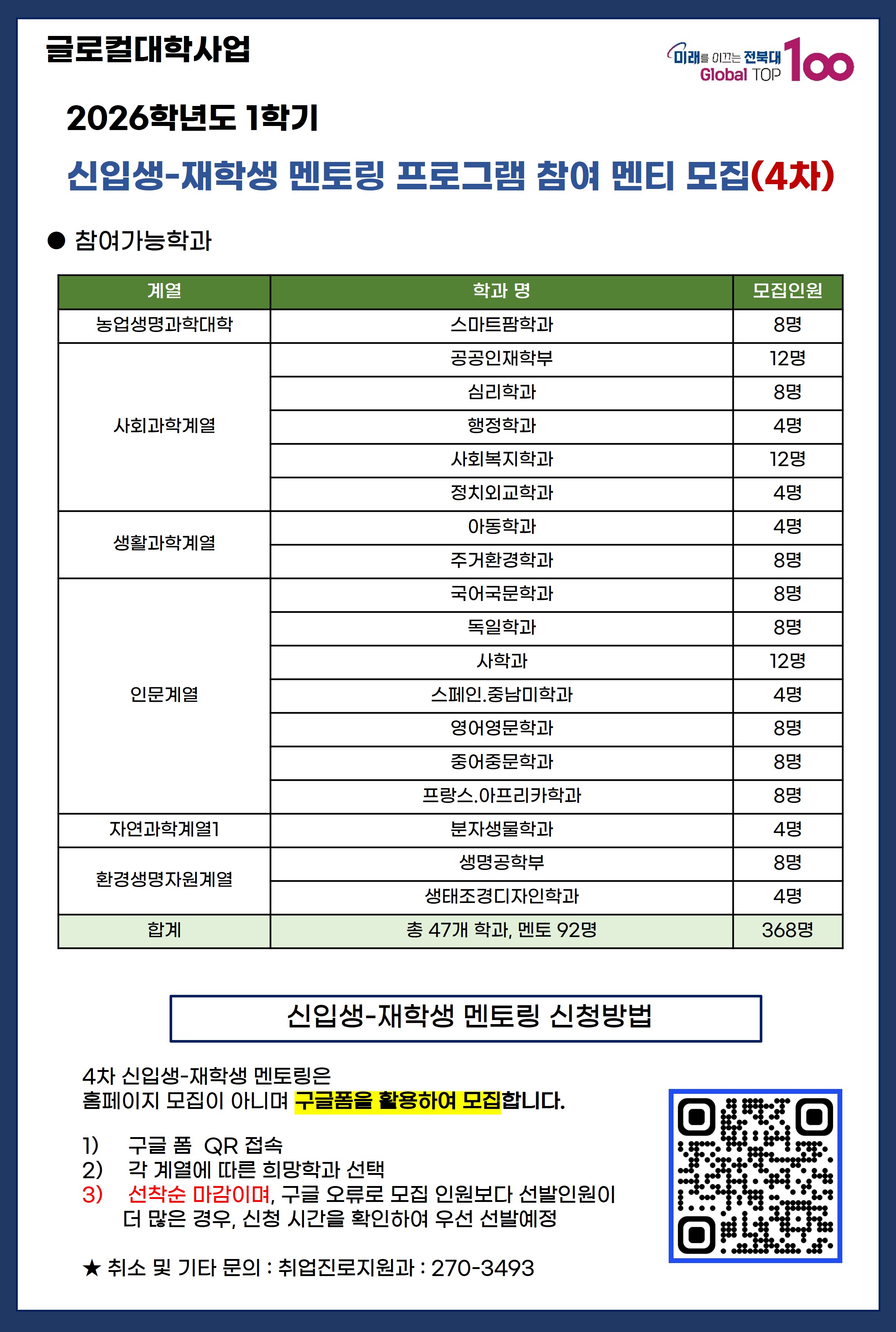 본 프로그램은 2026학년도 광역화 모집 대상 신입생에게 전공 탐색 기회를 제공하기 위해 개설된 멘토링 프로그램입니다.