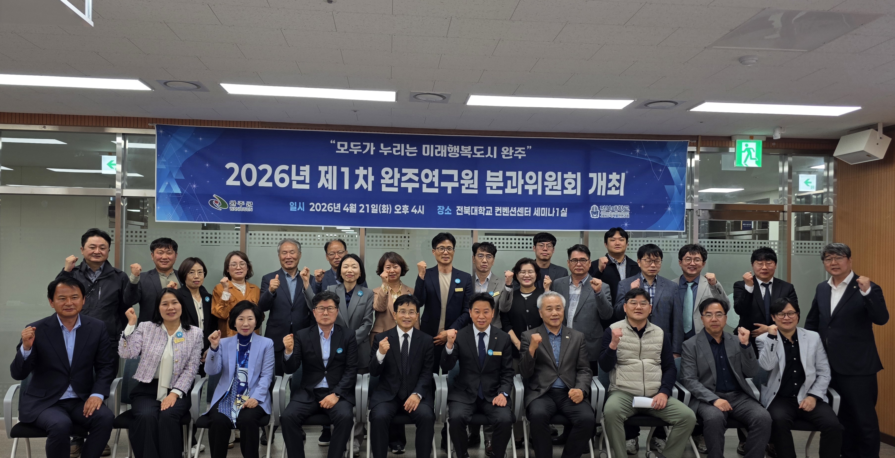 완주군과 JBNU 지역발전연구원은 21일 오후 4시 전북대 컨벤션센터 세미나실에서 ‘2026년 제1차 완주연구원 분과위원회’를 개최하고, 2025년 주요 성과와 2026년 운영 방향을 공유했다. 이번 회의는 전북대가 글로컬대학 사업의 일환으로 추진 중인 ‘지자체 현안 해결 프로젝트’를 완주군 정책에 실질적으로 반영하기 위한 협력 절차로 마련됐다.