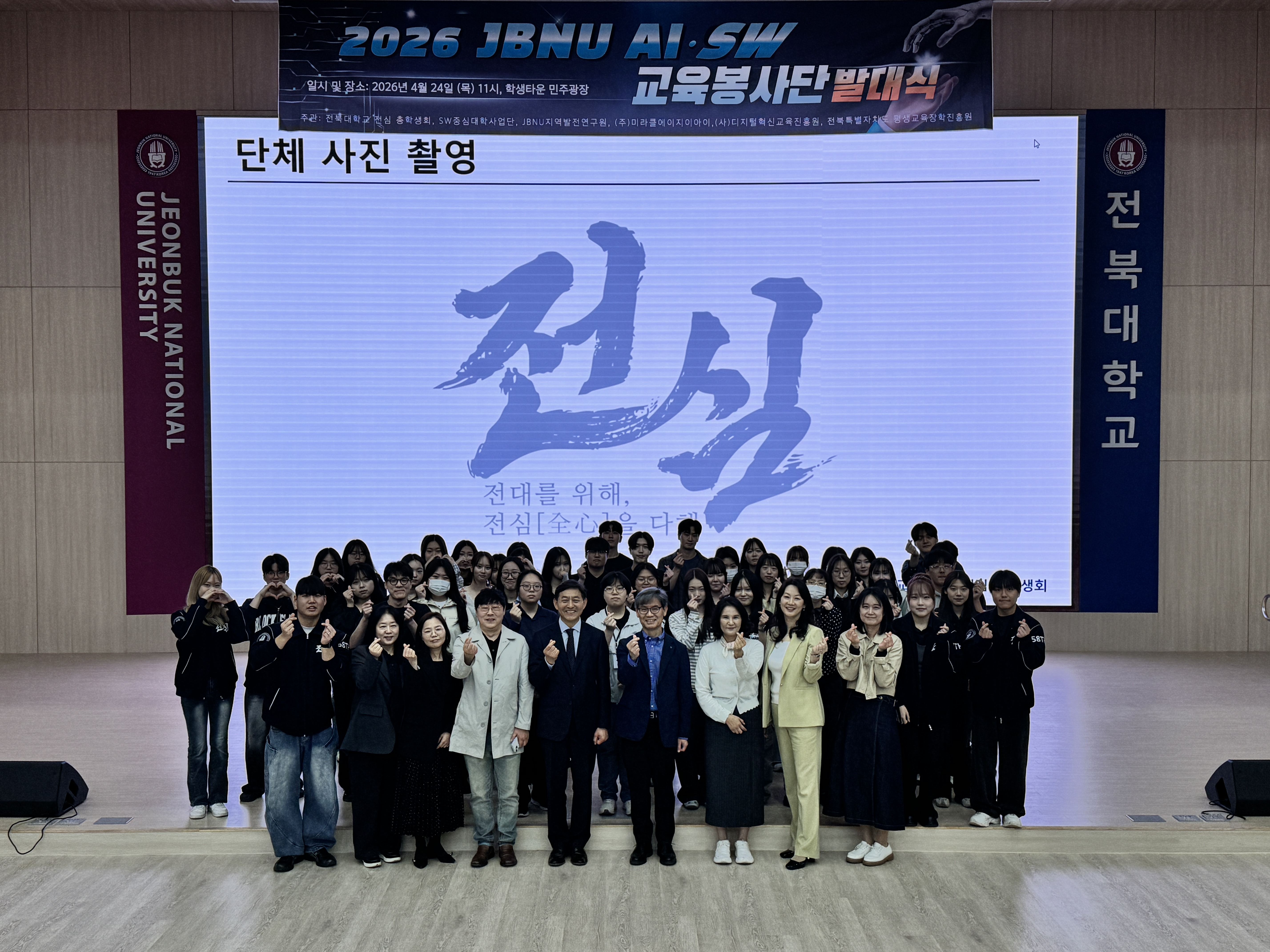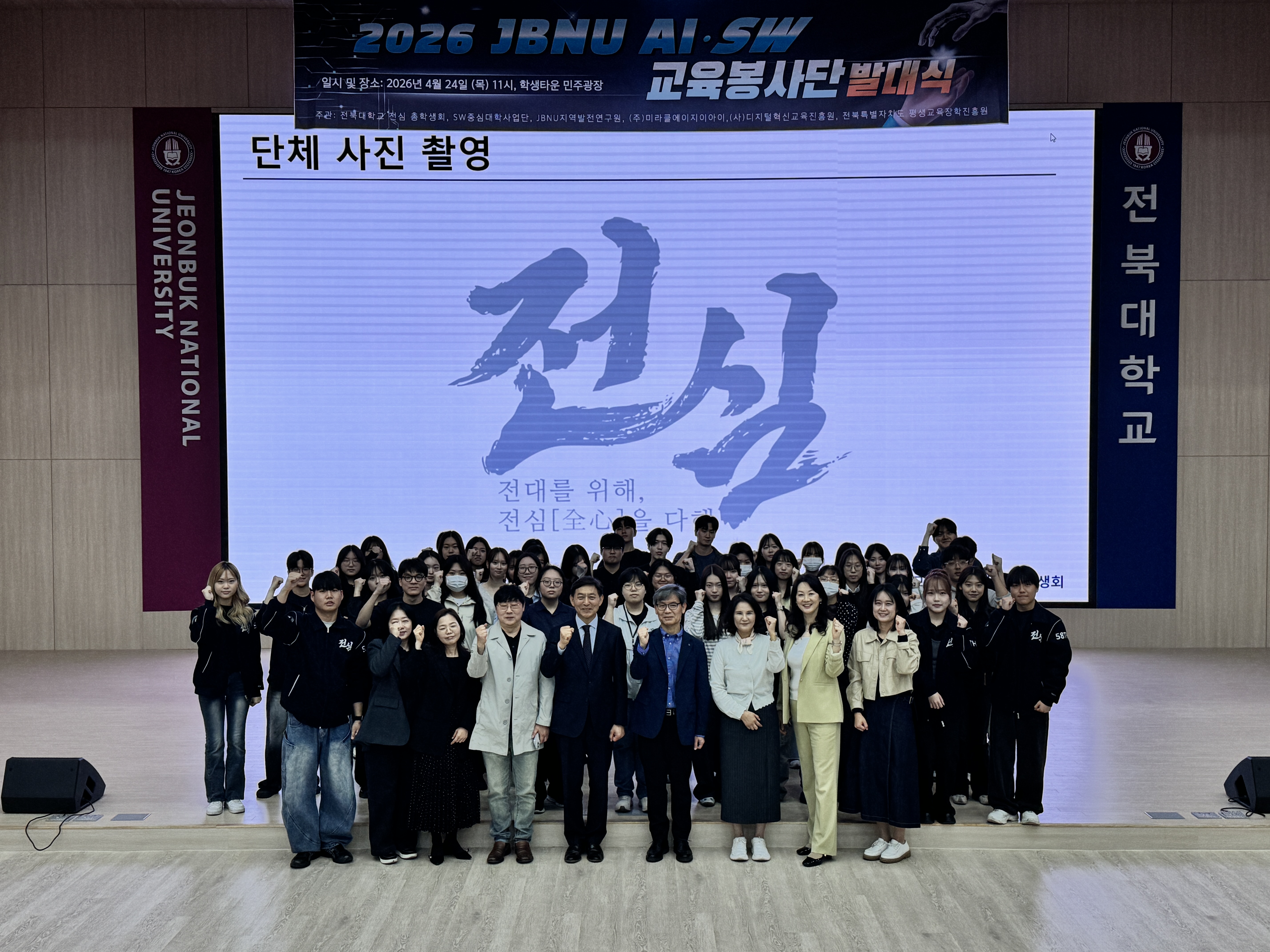 전북대학교 SW중심대학사업단(단장 김성찬)과 전심 총학생회(총학생회장 류이노)는 4월 24일 오전 11시 교내 학생타운 4층 민주강당에서 ‘2026 JBNU AI·SW 교육봉사단 발대식’을 개최하고, 지역사회 대상 AI·SW 교육봉사 활동의 본격적인 출발을 알렸다.