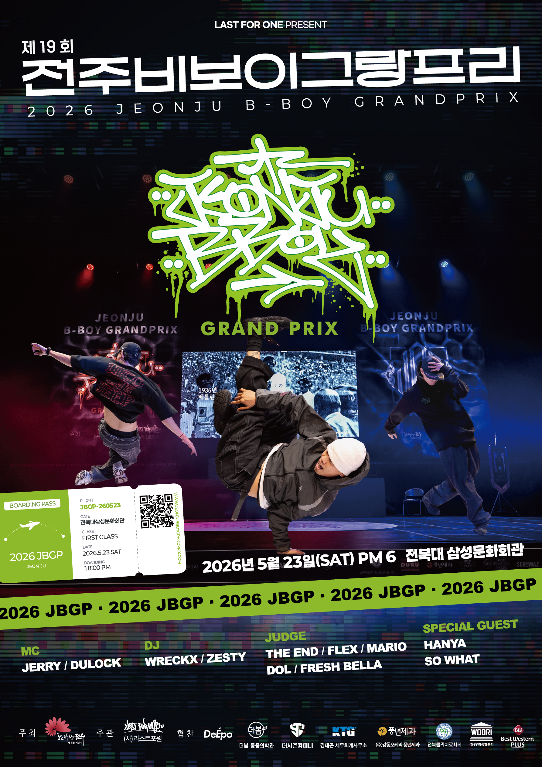 3. 전주시가 주최하고 ()라스트포원이 주관하는 이번 대회는 국내외 정상급 비보이팀들의 경연과 국내외 검증된 실력파 심사위원들의 쇼케이스, 각종 대회에서 우수한 성과를 거두고 화려한 퍼포먼스를 선보였던한야’,‘소왓등 게스트들의 특별공연도 준비되어 있습니다.