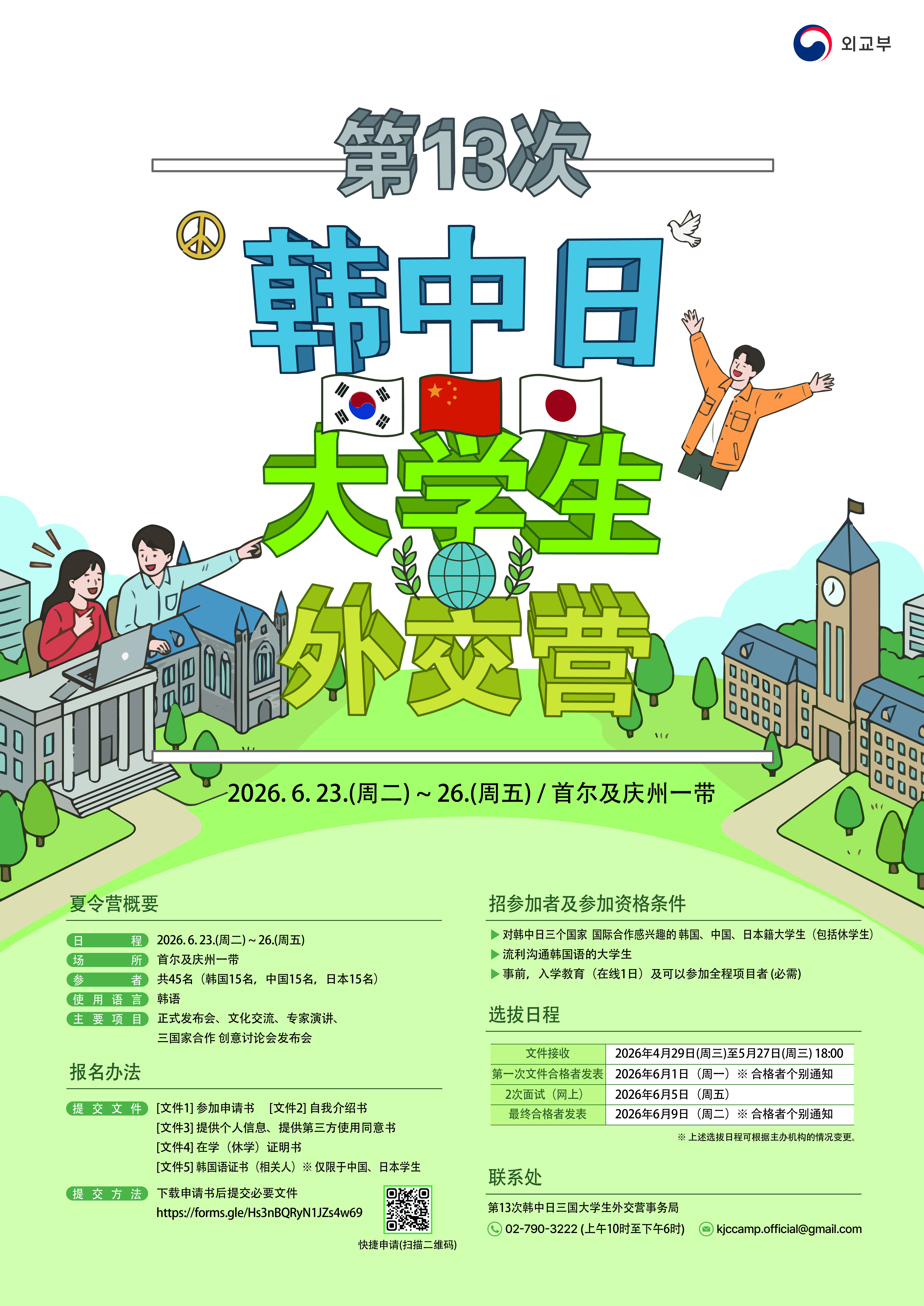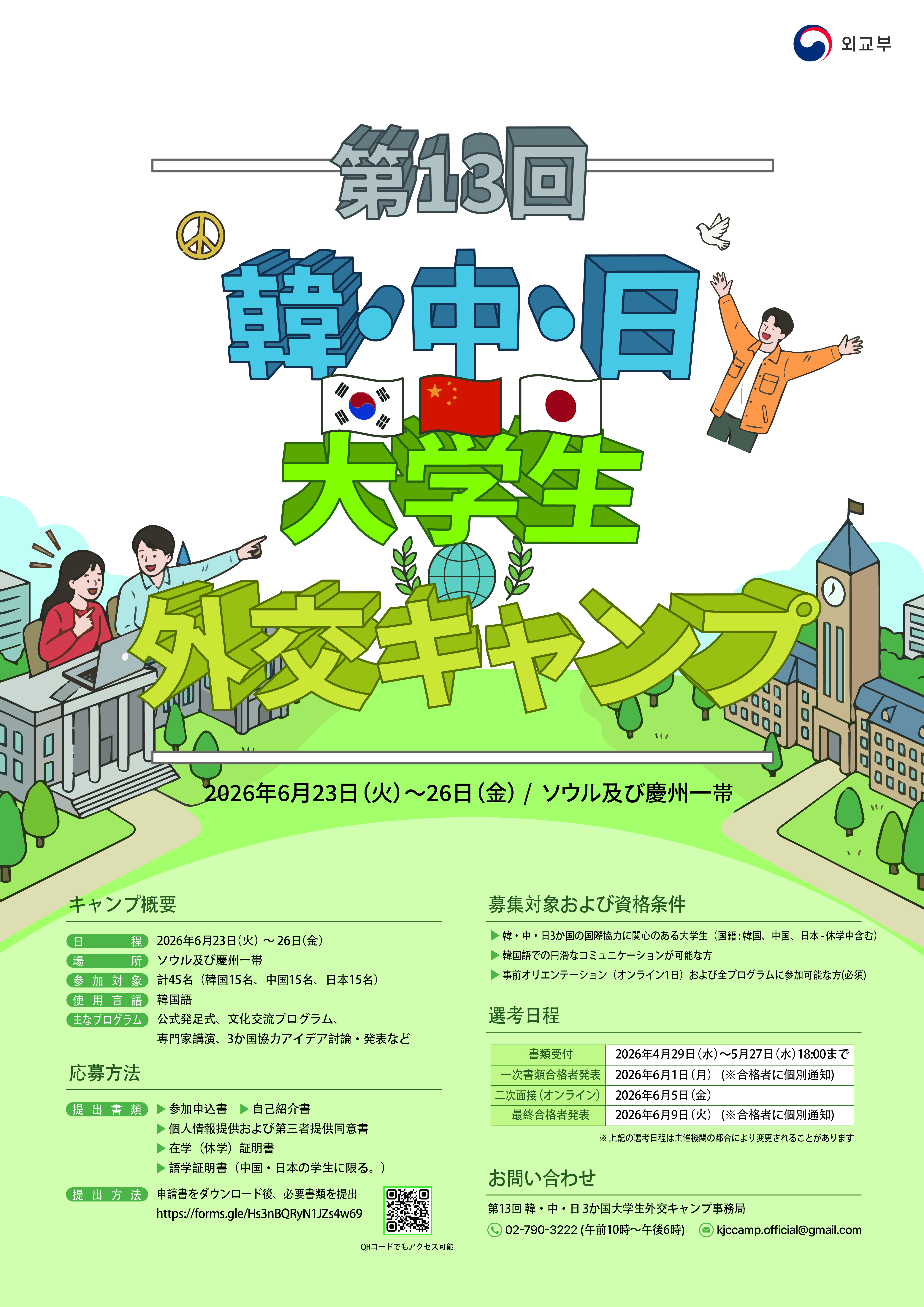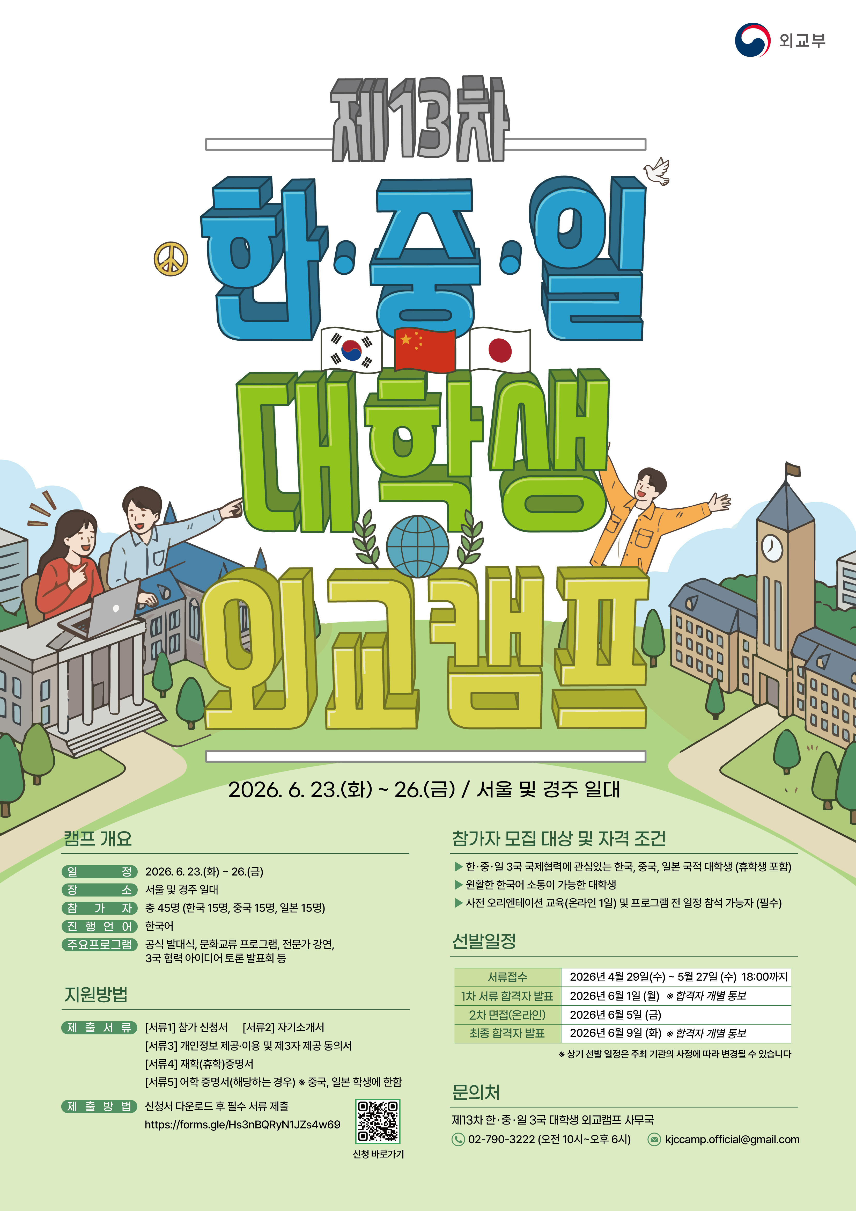 외교부에서 제13차 한중일 대학생 외교캠프를 개최합니다. 관심있는 학생들의 참여 바랍니다.