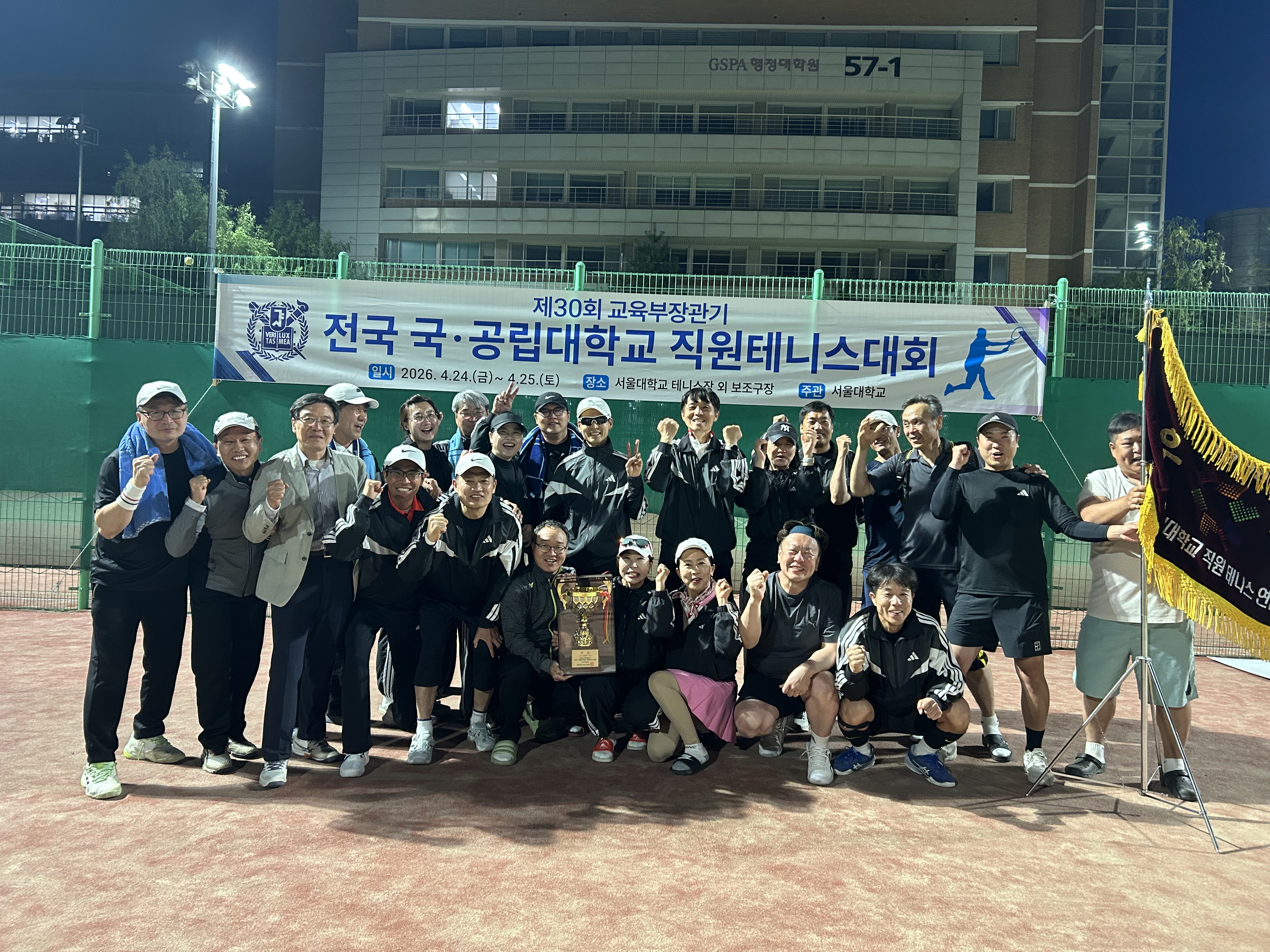 전북대학교가 4월 23일부터 25일까지 서울대학교에서 열린 제30회 교육부장관기 전국 국공립대학 직원 테니스대회에서 단체전 정상에 오르며 강한 저력을 입증했다.