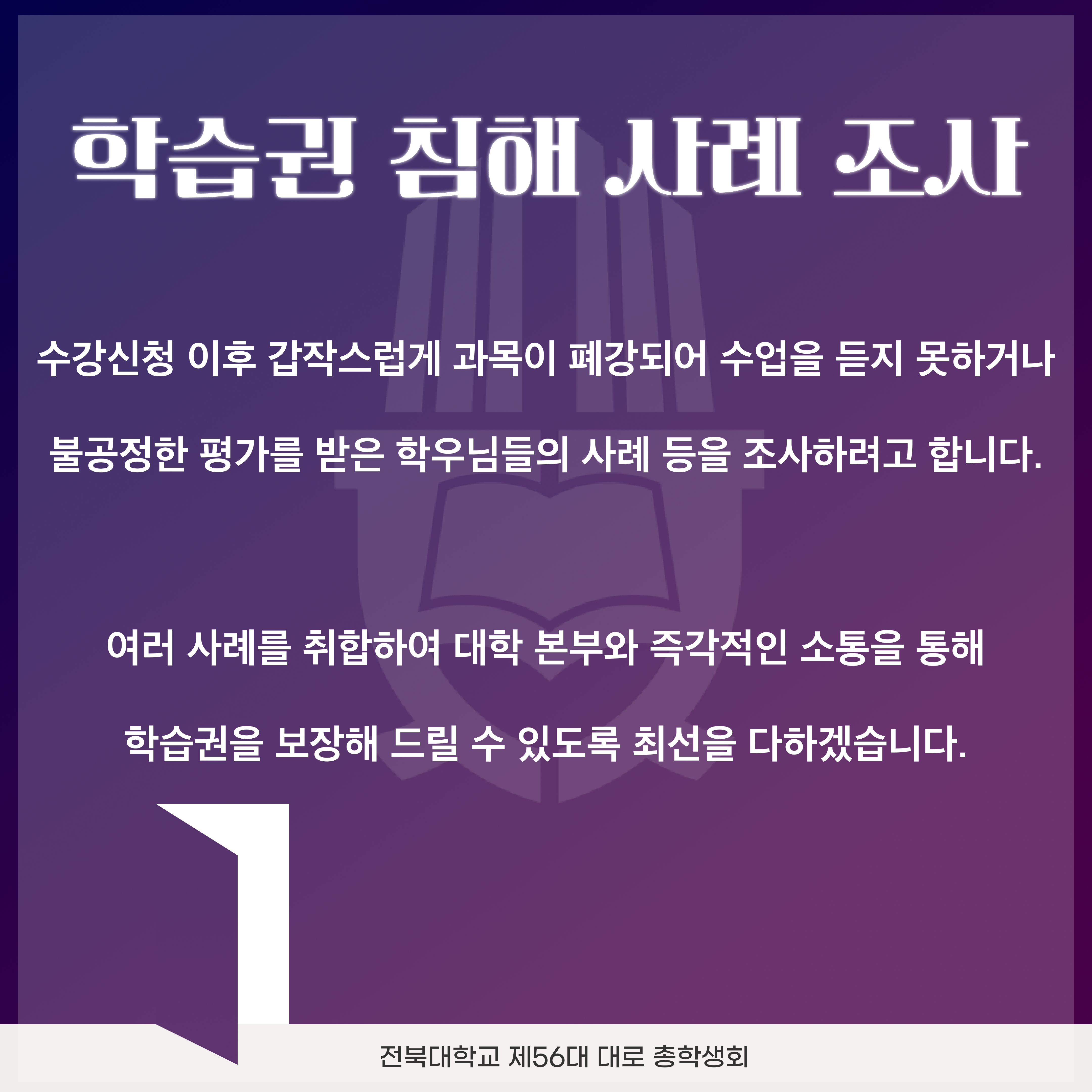 이를 위해 수강신청 이후 갑작스럽게 과목이 폐강되어 수업을 듣지 못하거나 불공정한 평가를 받은 학우님들의 사례 등을 조사하려고 합니다. 여러 사례를 취합하여 대학 본부와 즉각적인 소통을 통해 학습권을 보장해 드릴 수 있도록 최선을 다하겠습니다.