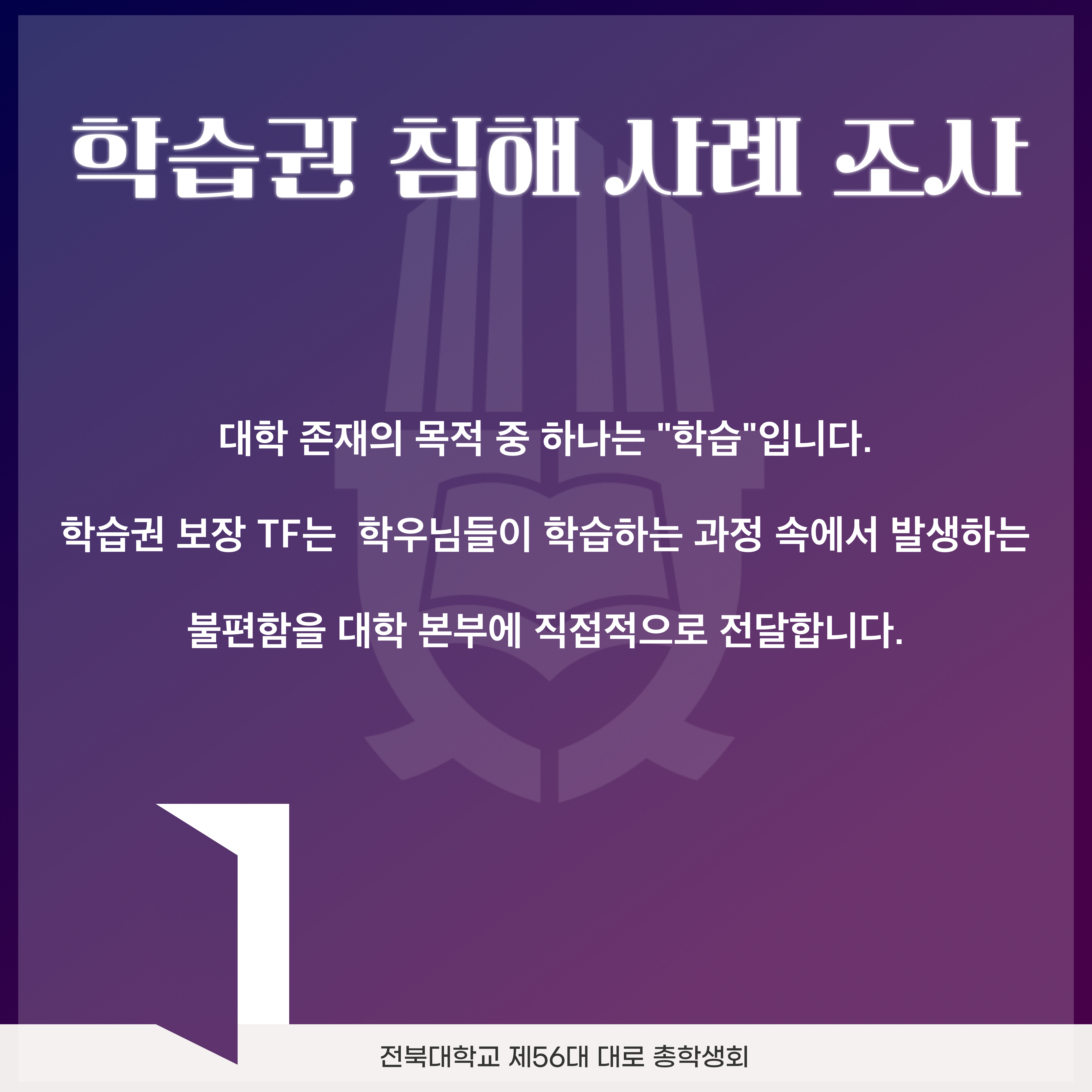 대학 존재의 목적 중 하나는 "학습"입니다. 학습권 보장 TF는 학우님들이 학습하는 과정 속에서 발생하는 불편함을 대학 본부에 직접적으로 전달합니다.