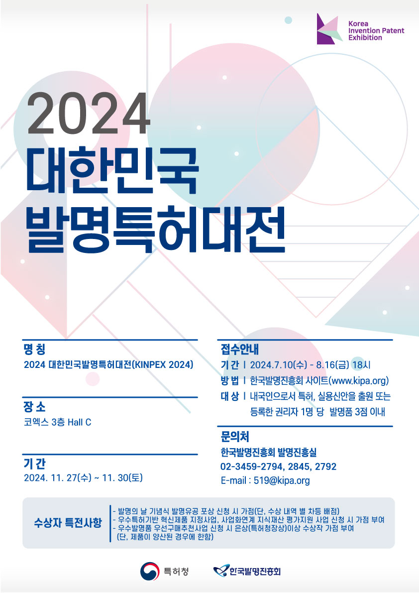 2024년도 대한민국발명특허대전 출품 신청 접수가 8. 16.(금) 18시까지 진행되오니 많은 관심과 신청 부탁드립니다.
