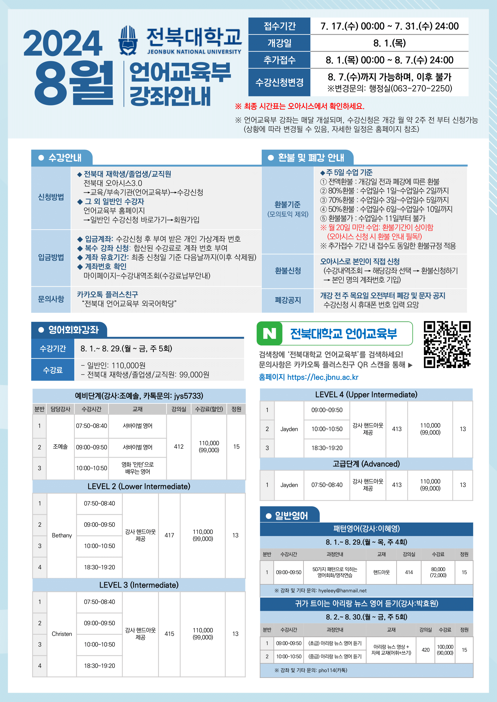 [언어교육부] 8월 외국어 강좌 안내(모의토익 신청자 붙임 필히 참조)