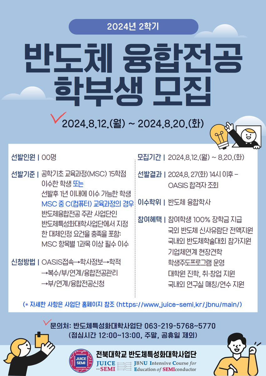 반도체특성화대학사업단에서 2024년도 2학기 ⌈반도체융합전공⌋ 학부생을 모집하오니 많은 관심 바랍니다.
