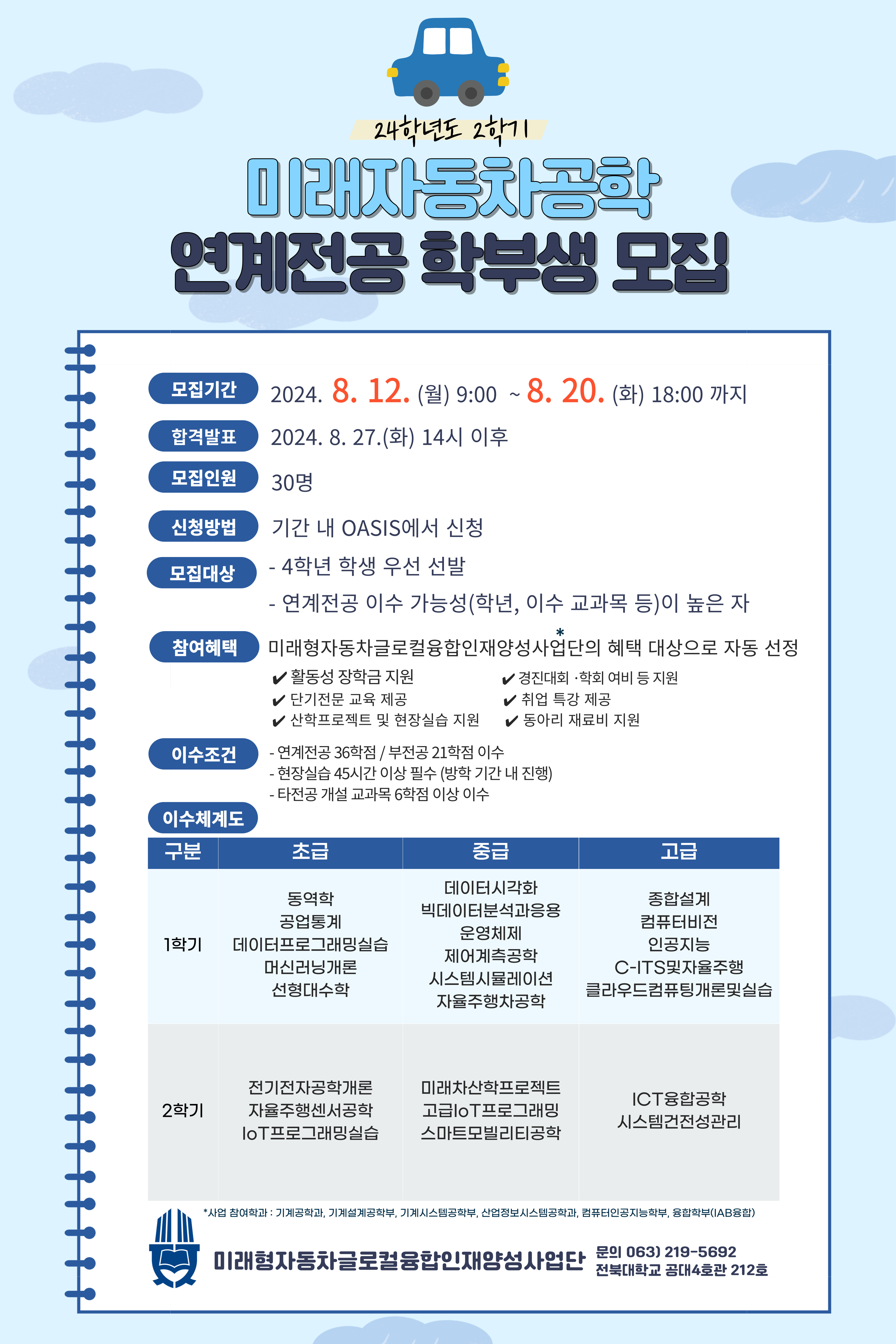 2024학년도 2학기 미래자동차공학 연계전공 학부생 모집에 많은 관심 부탁드립니다.