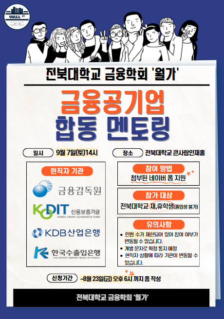 전북대학교 취업동아리 월가에서 금융공기업 현직자(금융감독원, 신용보증기금, 한국산업은행, 한국수출입은행) 합동멘토링을 개최합니다.