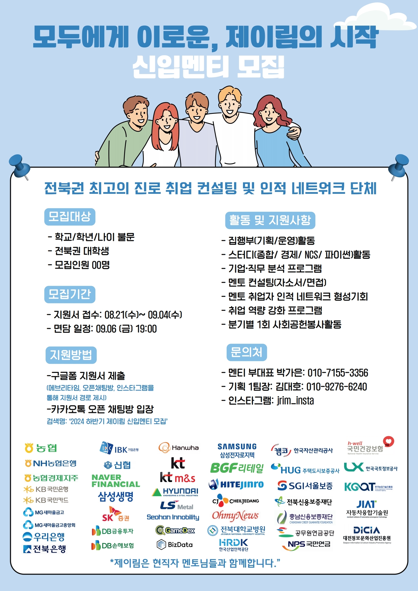 전북권 최고의 진로,취업 컨설팅 & 인적네트워크 형성 단체 ’제이림‘에서 신입멘티를 모집합니다.<o:p></o:p>