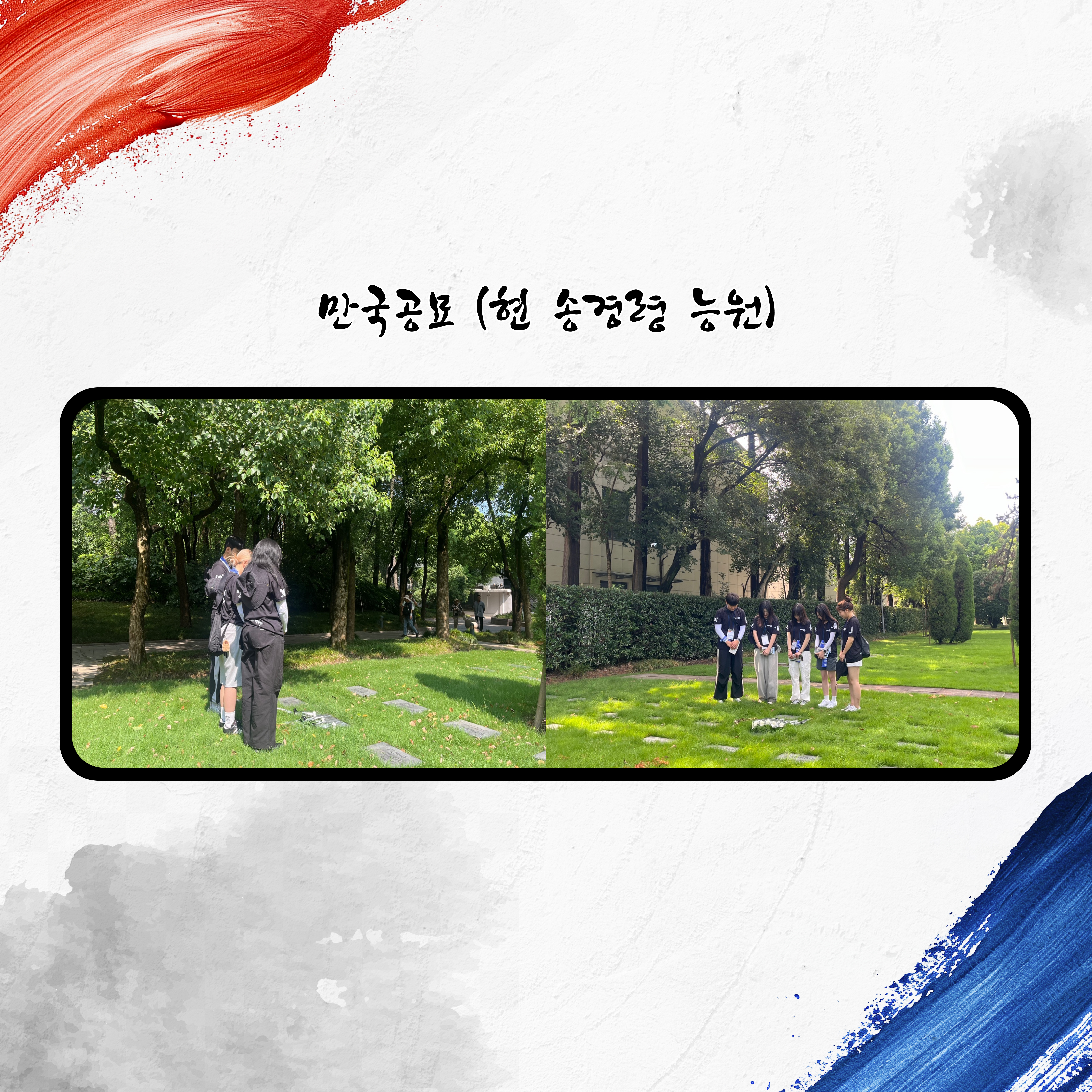 상하이에서 활동했던 한국 독립운동가들이 주로 안장되어 있는 묘지로, 사전에 준비한 국화꽃으로 독립을 위해 헌신하였던 독립운동가에 헌화하였습니다.