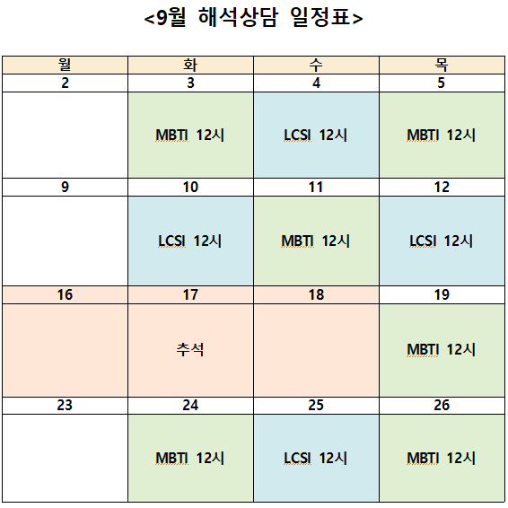○ 10월 심리검사 신청 일정은 9월 넷째주 월요일(9/23)에 확인할 수 있습니다.