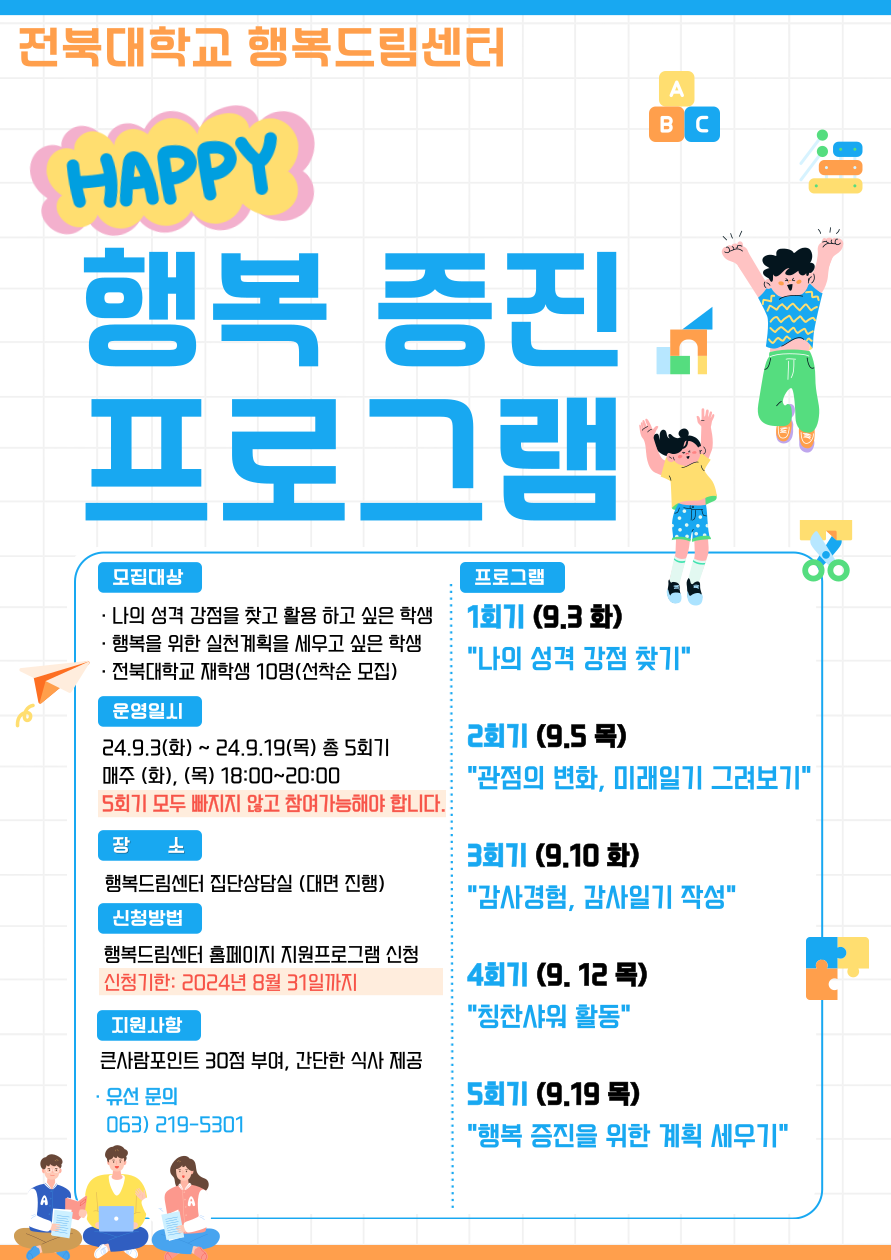 - 신청링크 : 전북대학교 행복드림센터 - 지원프로그램 (jbnu.ac.kr), https://happycenter.jbnu.ac.kr/main/menu?gc=SProgram&do=sinform&spcate=2&program_id=7vT0v51m_Zt66c8198e&psin_id=Hm2bzAEzLxQ66c8198e