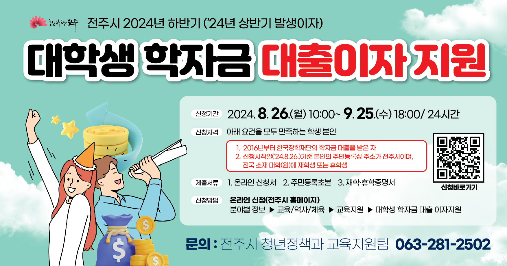 전주시에서는 2024년 하반기 대학생 학자금대출 이자 지원사업을 시행한다 하오니 신청하여 지원 받으시기 바랍니다.