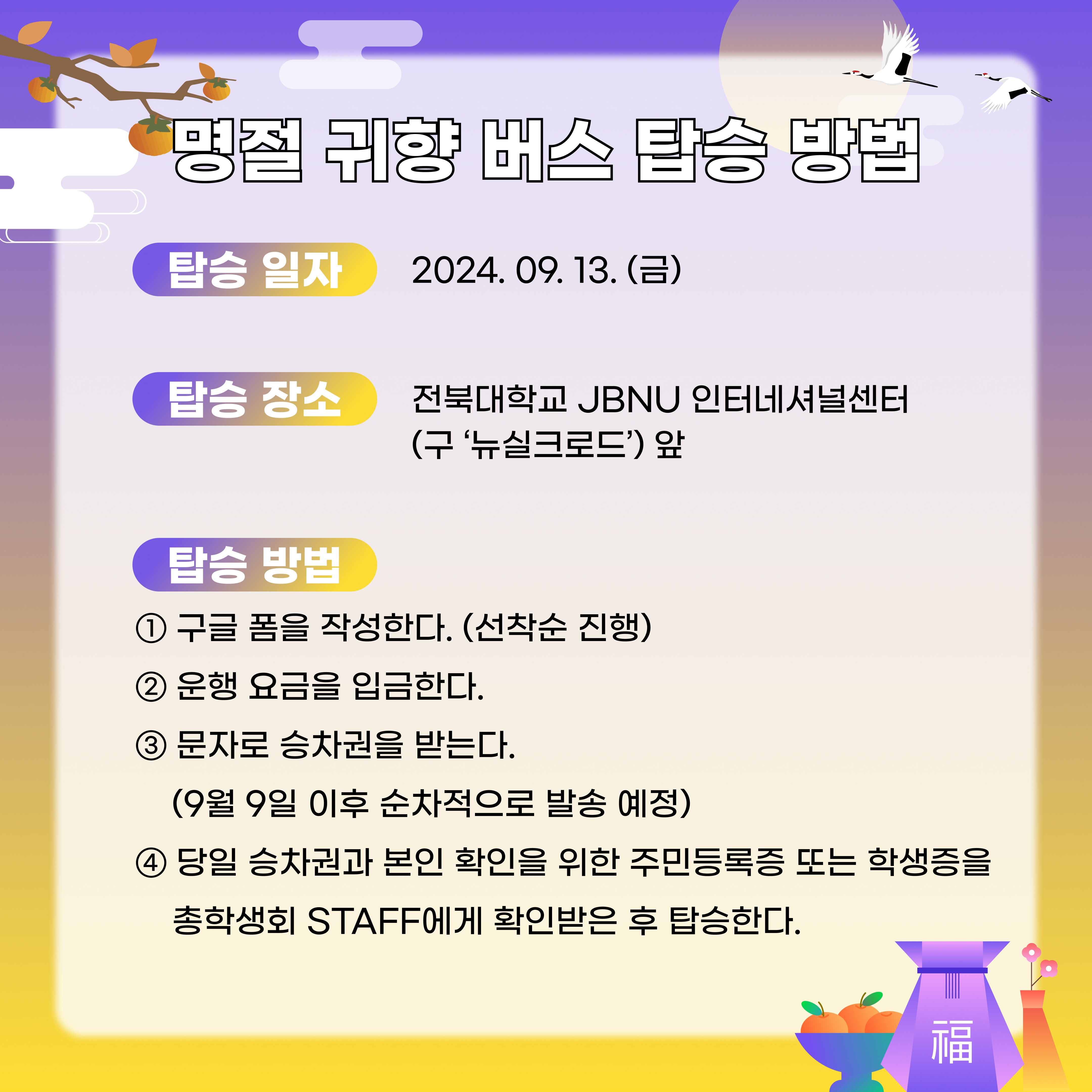 - 탑승 장소 : 전북대학교 JBNU 인터네셔널센터 (구 '뉴실크로드') 앞