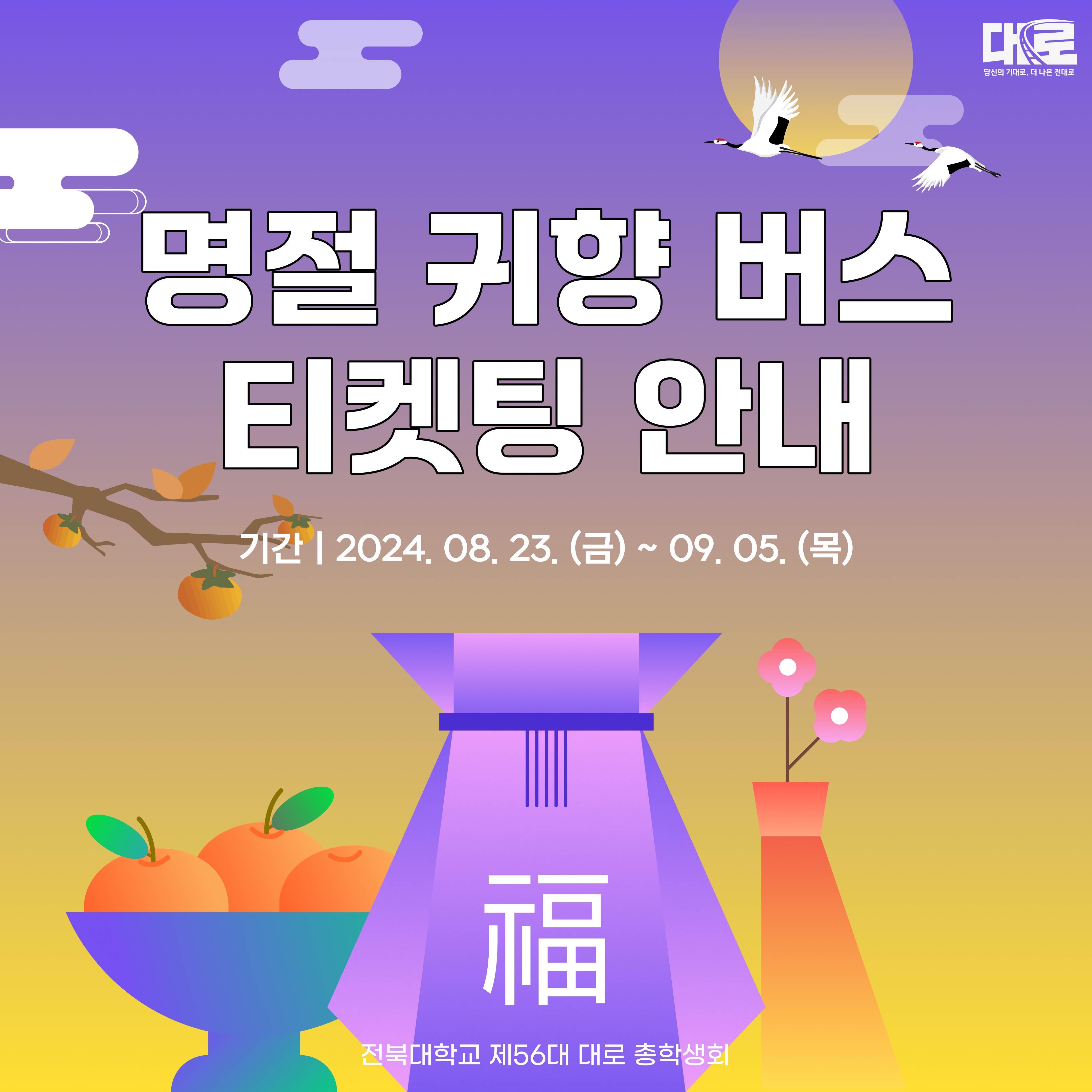 이번 추석 명절 기간 동안 학우님들의 경제적인 부담을 줄여주고, 더욱 편안하고 안전하게 귀향할 수 있도록 대로 총학생회에서 명절 귀향 버스를 운행하려고 합니다.
