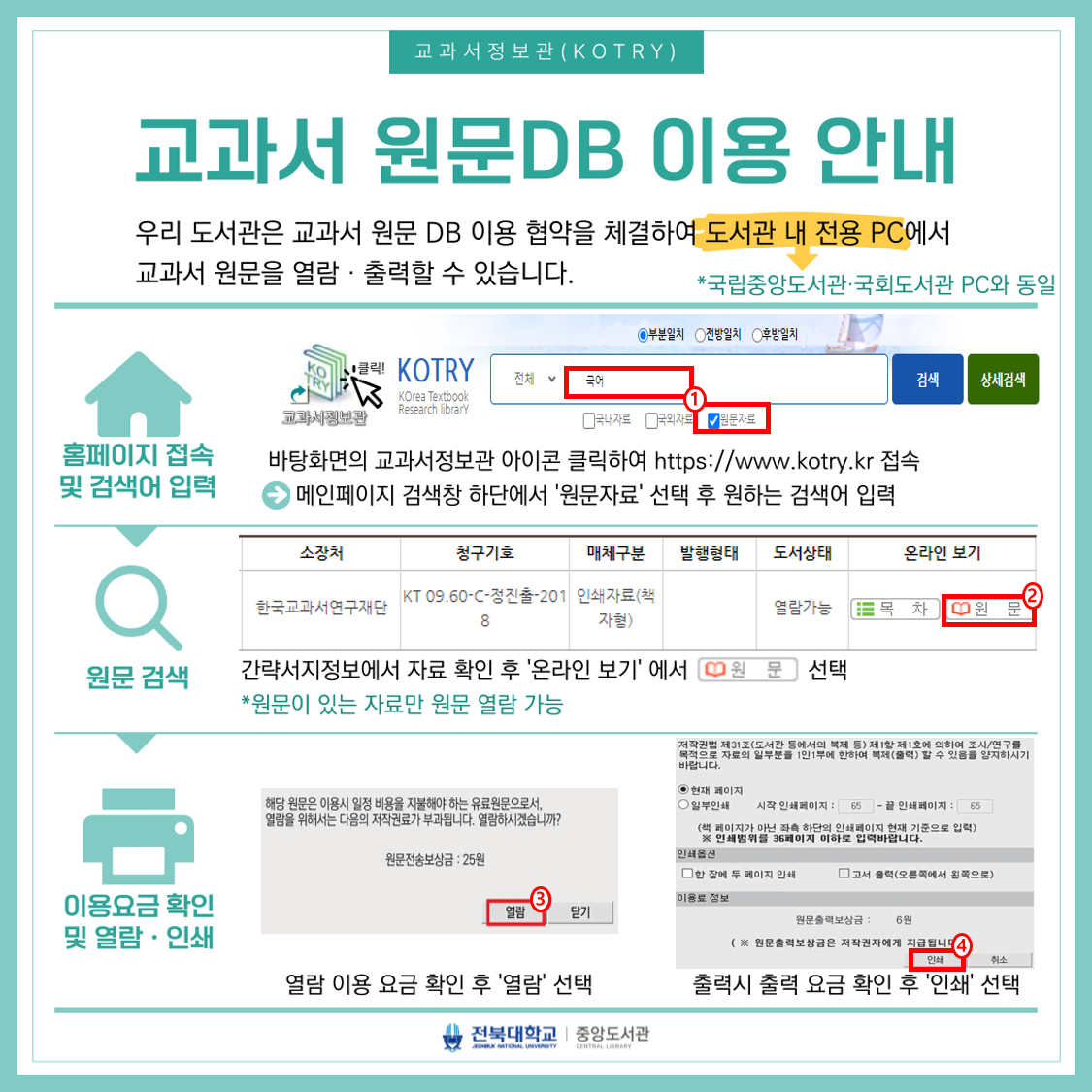 우리 도서관은 교과서 원문 DB 이용 협약을 체결하여 도서관 내 전용 PC(국립중앙도서관·국회도서관 PC와 동일)에서 교과서 원문을 열람·출력할 수 있습니다.