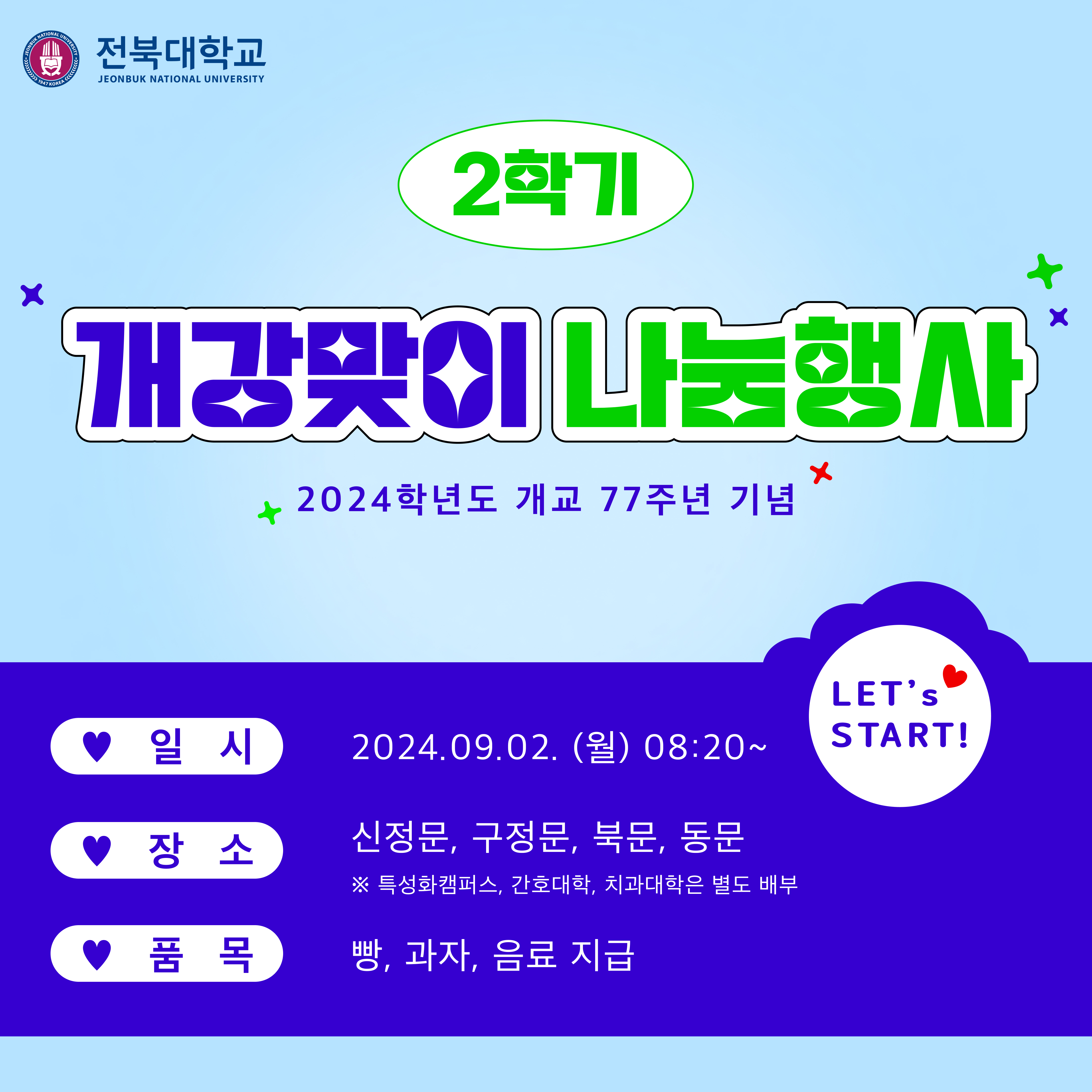 안녕하세요, 전북대학교 제56대 대로 총학생회입니다. 2024학년도 2학기 개강을 맞이하여 대학본부 주관 나눔행사를 실시합니다. 빵, 과자, 음료를 나누어드리니 많은 관심 부탁드리겠습니다.