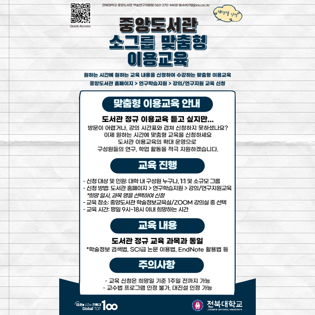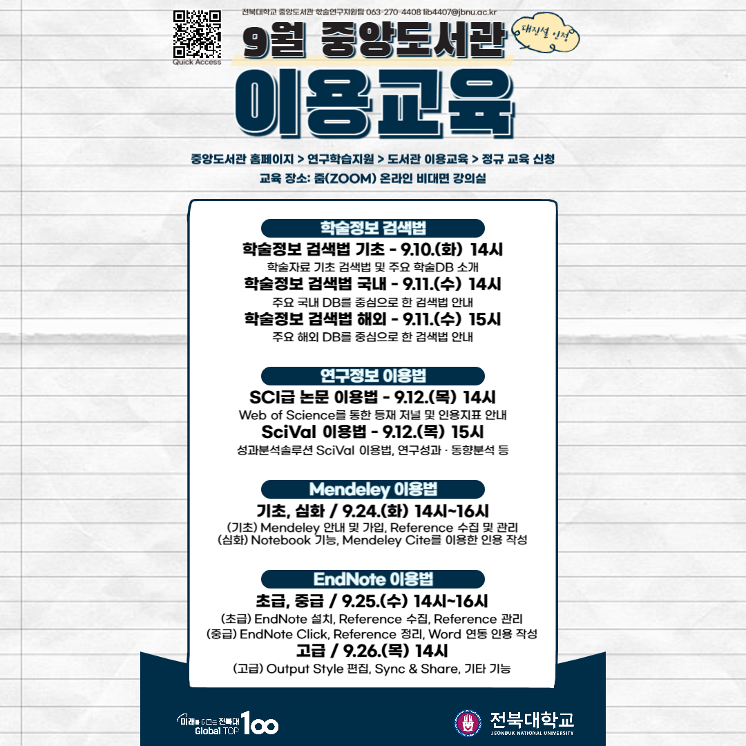 4. 교육문의: 중앙도서관 학술연구지원팀(270-4408, lib4407@jbnu.ac.kr)