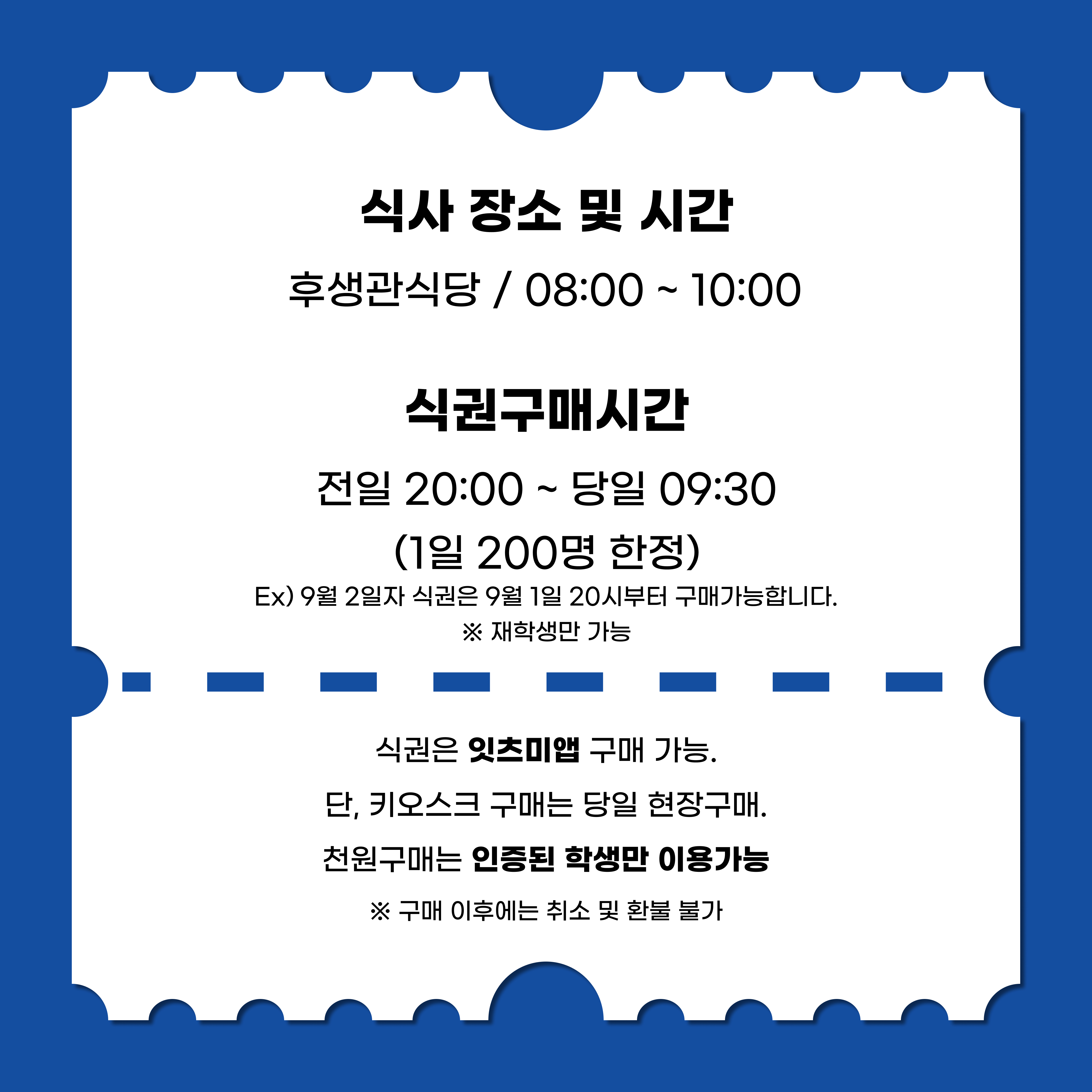 - 식권 구매 시간 : 전일 20:00 ~ 당일 09:30 (1일 200명 한정, 재학생만 가능)