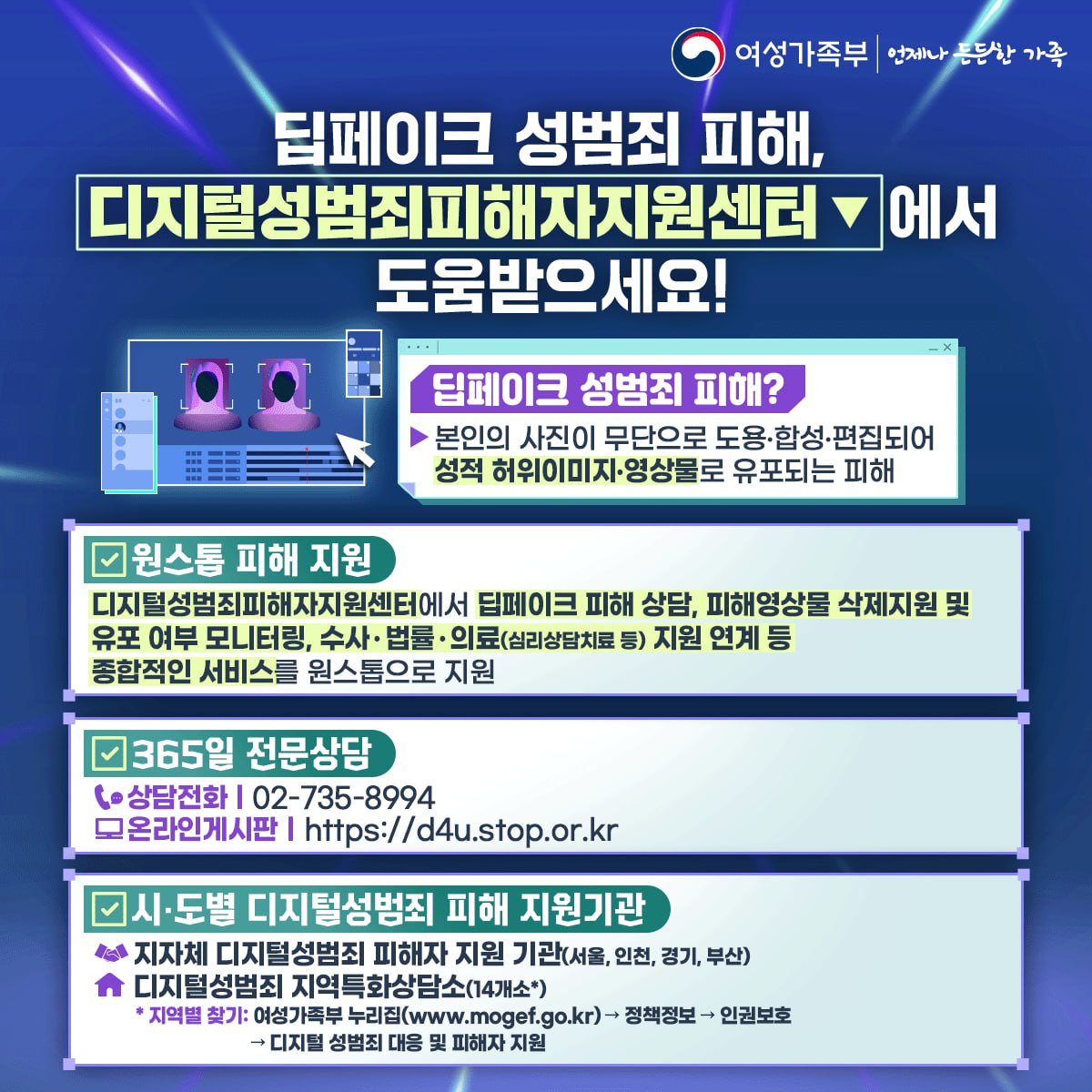 디지털 성범죄 발생 즉시 피해 신고 기관에 도움을 요청해 피해 확산 및 2차 피해를 예방할 수 있도록 함께 관심 가져주시기를 부탁드립니다