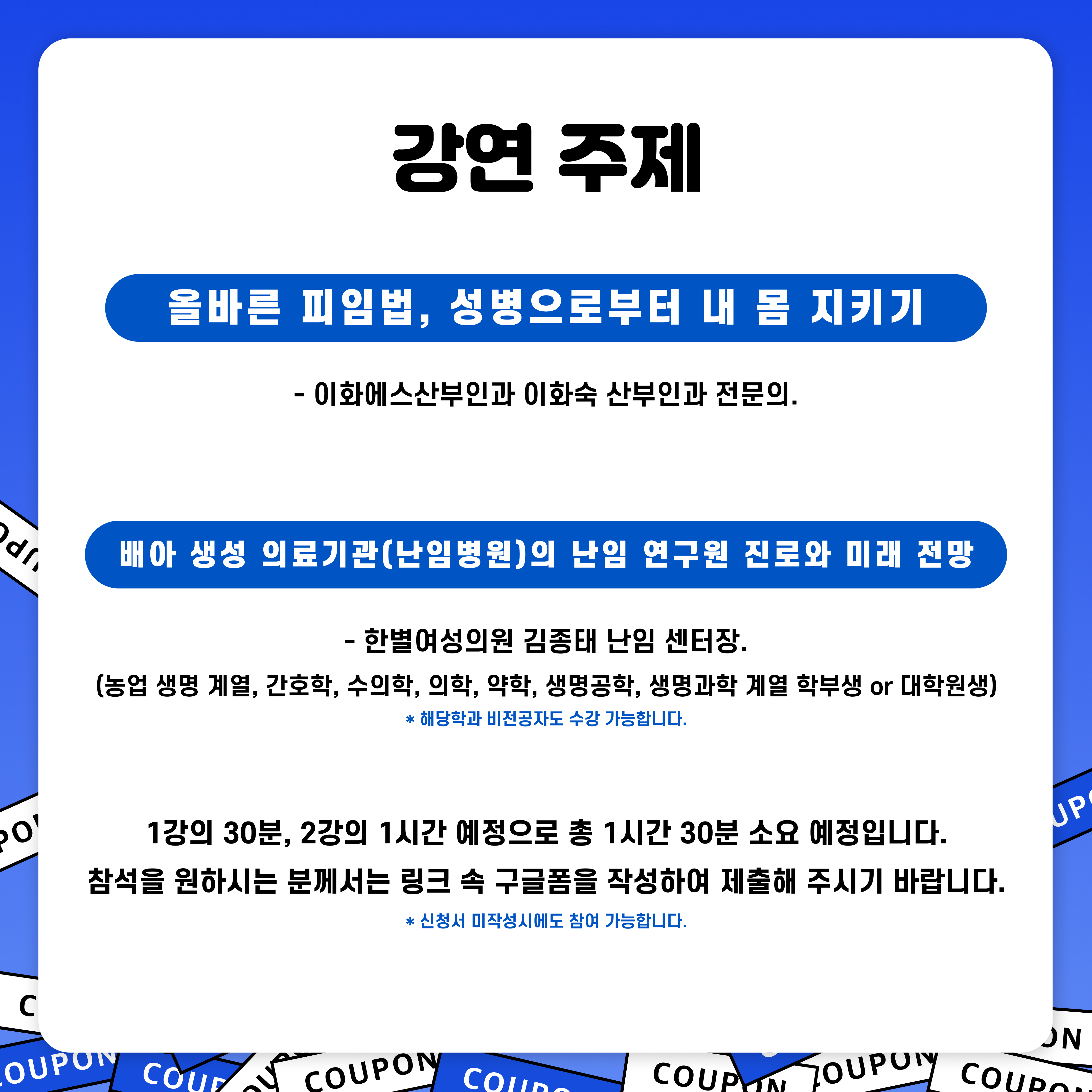 1강의 30분, 2강의 1시간 강연 예정이며, 총 1시간 30분이 소요 됩니다.